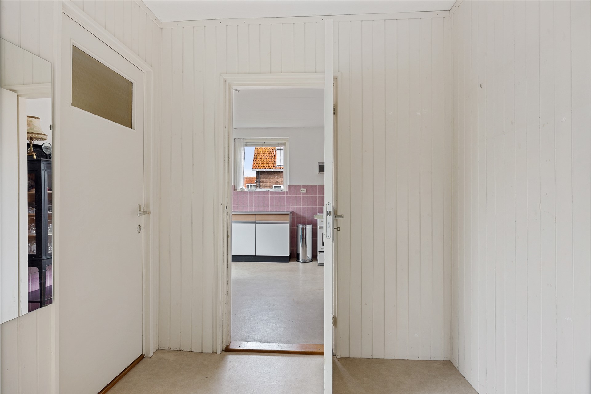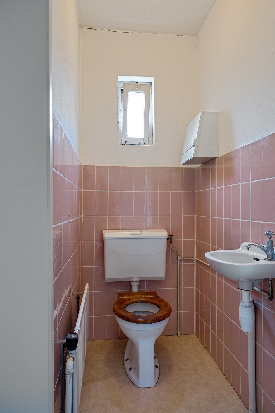 Met een entree in het midden van het huis, worden de vertrekken op de begane grond in tweeën gedeeld. De hal, met eenvoudige toiletruimte met fonteintje, meterkast en trapopgang, biedt toegang tot al deze ruimtes. Aan de voorzijde, met zicht op de groene voortuin en de straat, is een bijna 30m² grote woonkamer met ramen aan twee zijden te vinden. Vanuit de woonkamer is de praktische trapkast bereikbaar. Aan de hal is ook de eerste badkamer te vinden. Gedateerd, maar met voldoende ruimte voor een douche en wastafel met meubel. Deze badkamer heeft nu nog 2 deuren, waarvan er eentje in de bijkeuken uitkomt. Maak je die deur dicht, dan is er ruimte voor bijvoorbeeld een dubbele wastafel met meubel en een royalere douche.