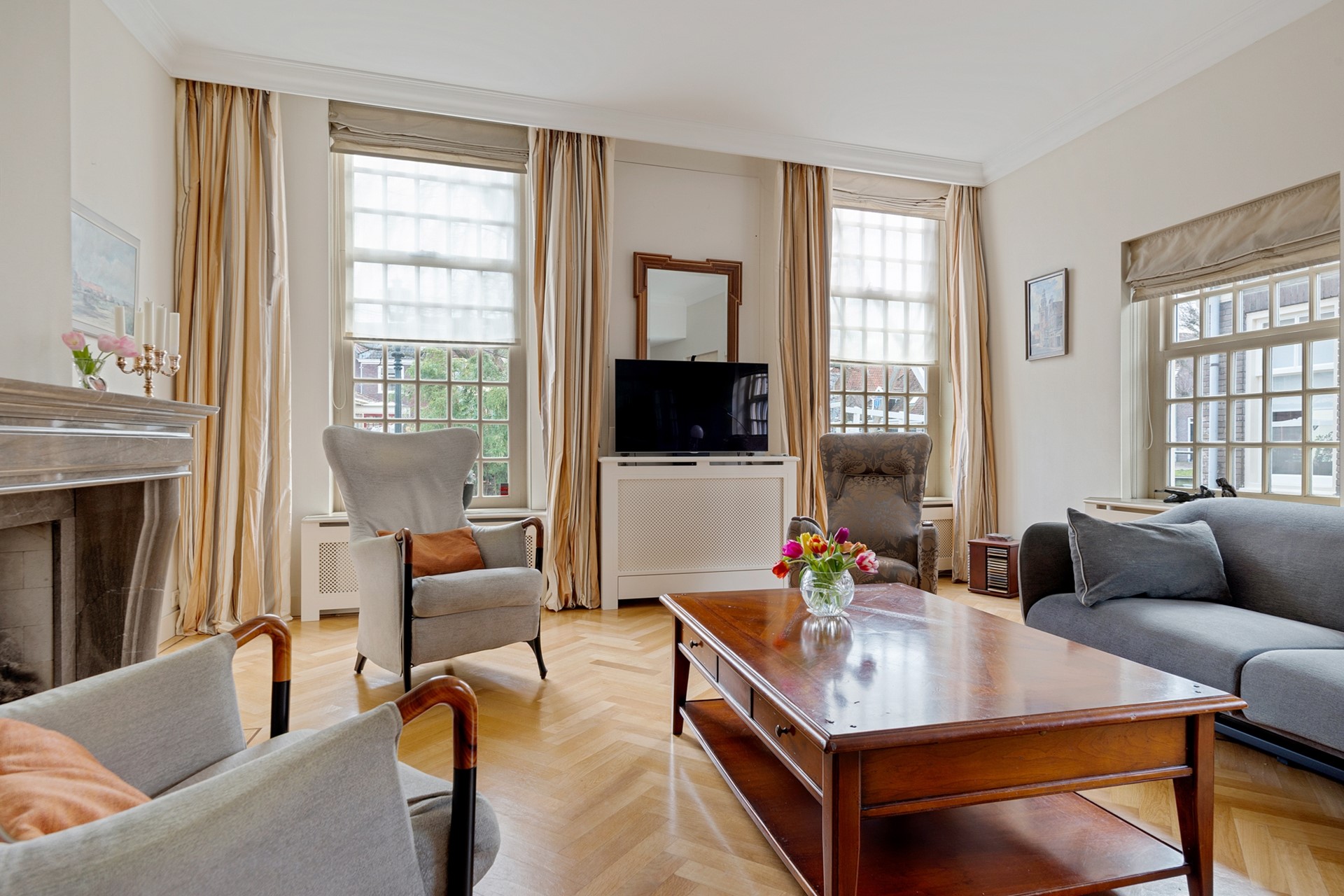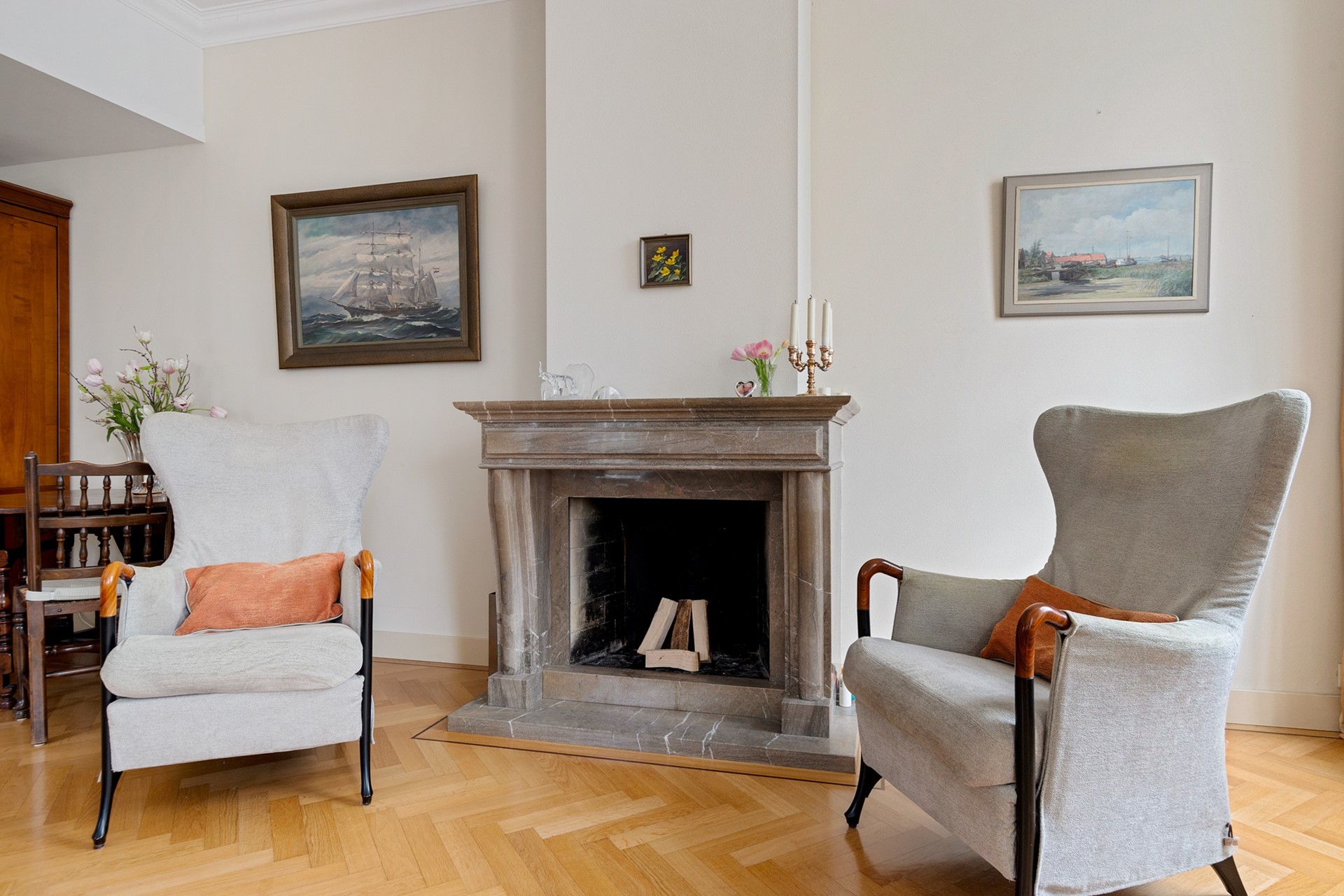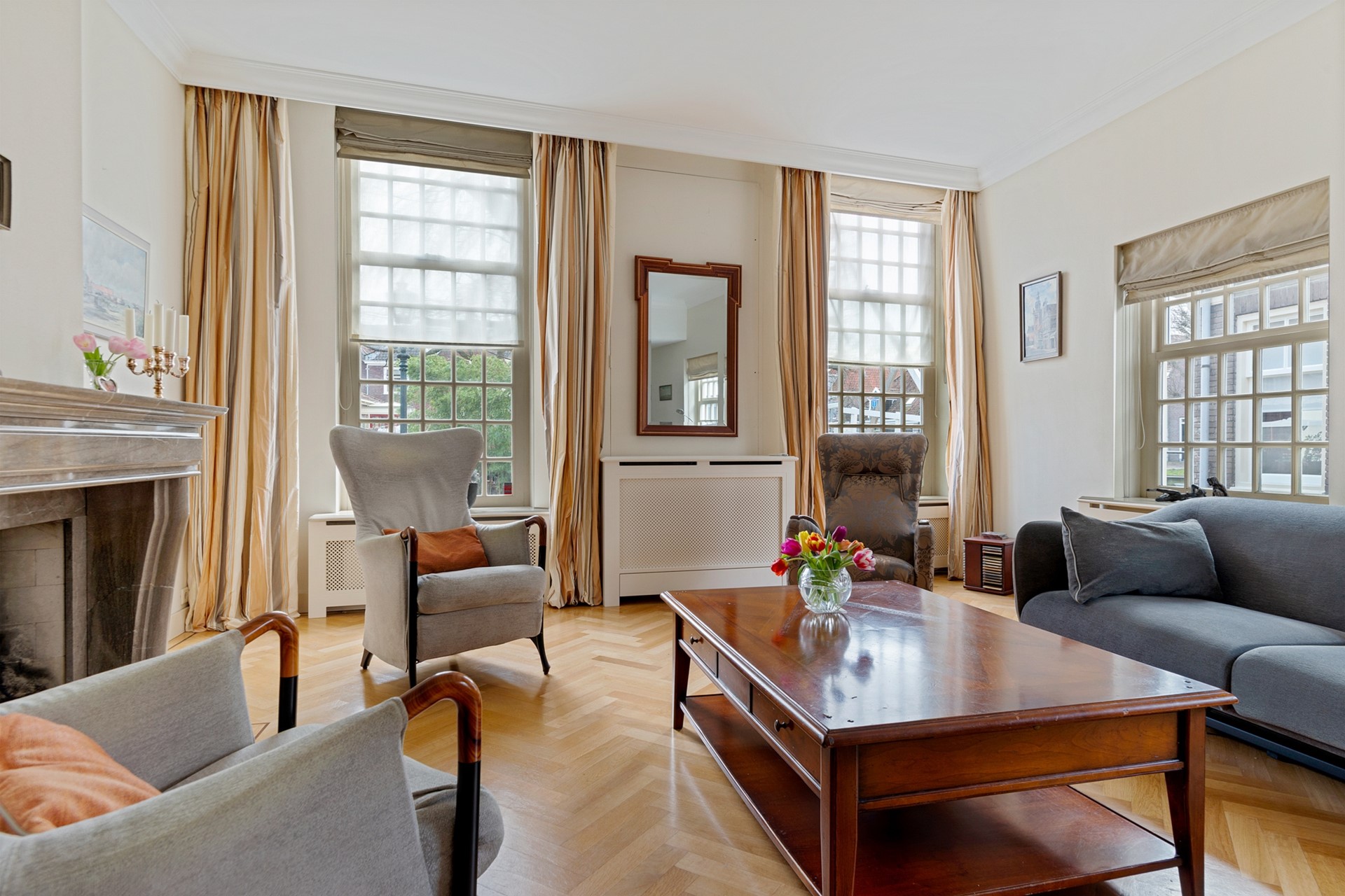 Hoewel er in de voorgevel een voordeur zichtbaar is, bevindt de officiële voordeur zich in de zijgevel aan de Schoolstraat. Achter deze voordeur tref je de ruime hal, voorzien van meterkast, moderne toiletruimte met fonteintje, trapopgang en toegang tot de verrassend praktische kelder van 17,5m² met daglichttoetreding. Aan de voorzijde van de woning ligt de woonkamer, die via de en-suite-deuren vanuit de hal te betreden is. Door de parketvloer in visgraatmotief, de ramen met roedeverdeling aan twee zijden van de woonkamer en het fraaie hoge plafond met sierlijst, is dit een heerlijk ruime en lichte kamer met uitzicht op de voorliggende gracht en hefbrug. De openhaard geeft de ruimte extra cachet.