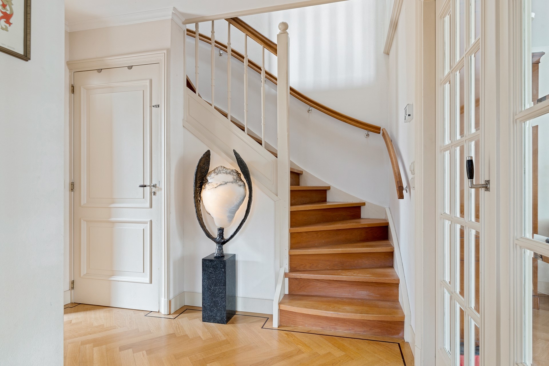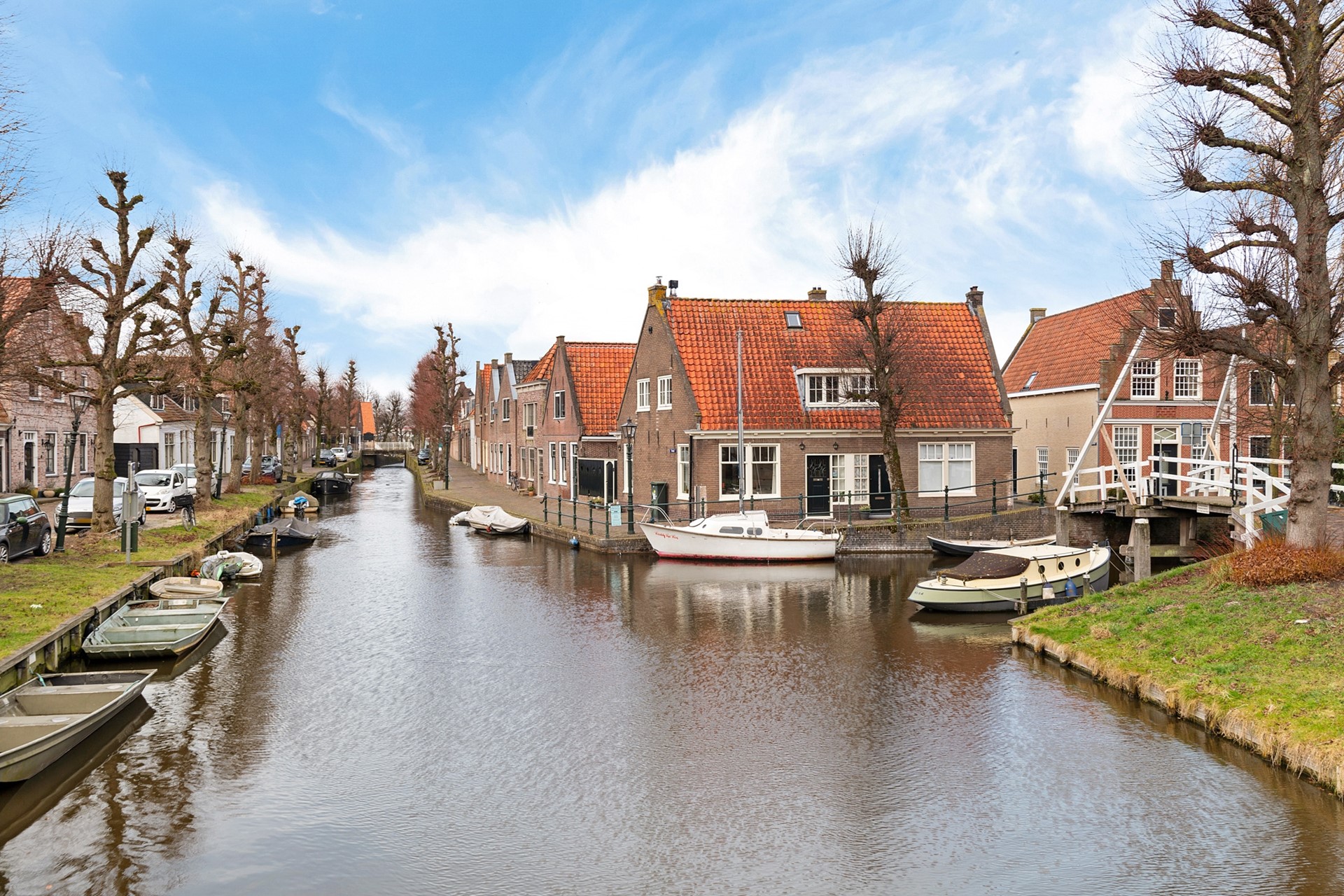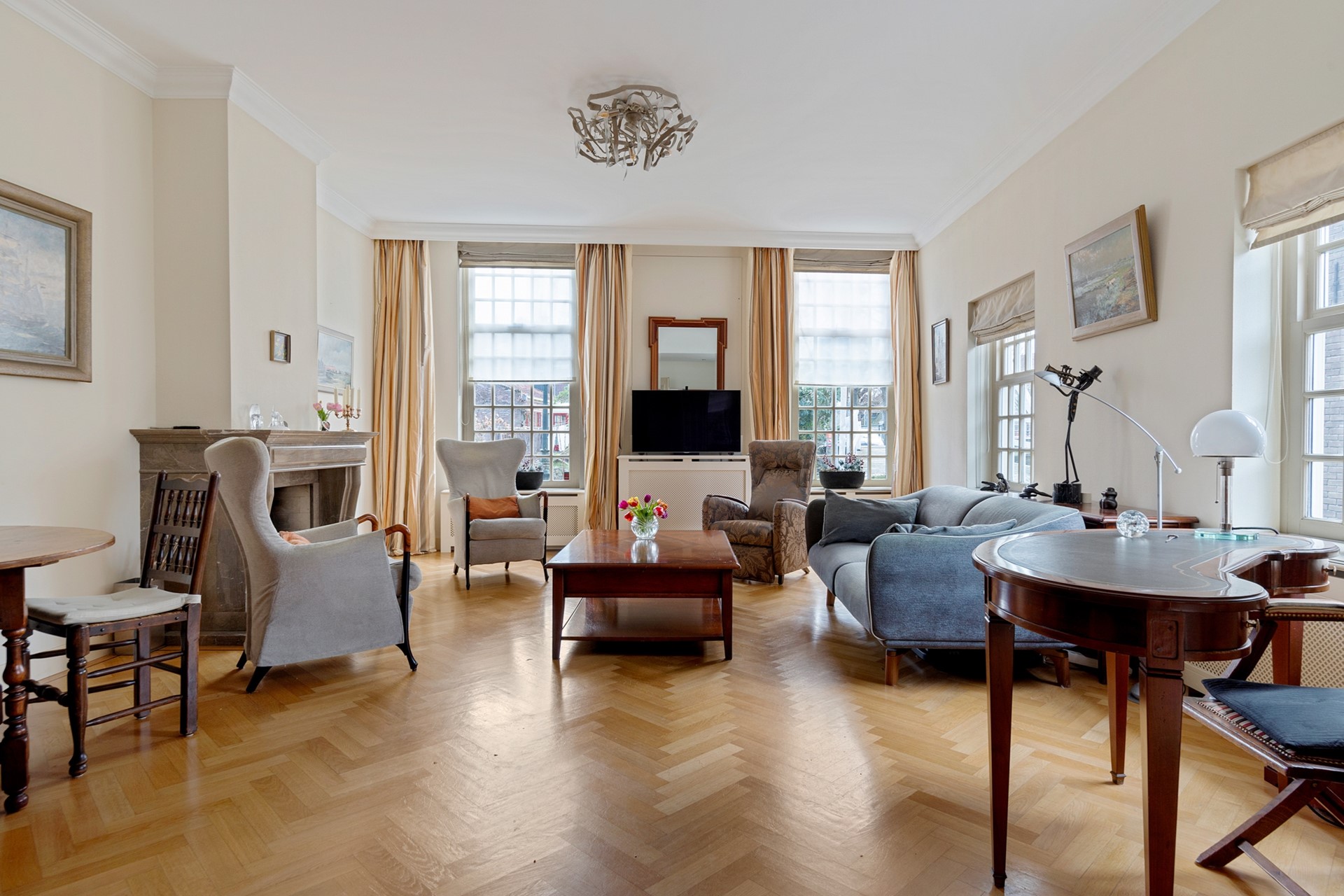 Hoewel er in de voorgevel een voordeur zichtbaar is, bevindt de officiële voordeur zich in de zijgevel aan de Schoolstraat. Achter deze voordeur tref je de ruime hal, voorzien van meterkast, moderne toiletruimte met fonteintje, trapopgang en toegang tot de verrassend praktische kelder van 17,5m² met daglichttoetreding. Aan de voorzijde van de woning ligt de woonkamer, die via de en-suite-deuren vanuit de hal te betreden is. Door de parketvloer in visgraatmotief, de ramen met roedeverdeling aan twee zijden van de woonkamer en het fraaie hoge plafond met sierlijst, is dit een heerlijk ruime en lichte kamer met uitzicht op de voorliggende gracht en hefbrug. De openhaard geeft de ruimte extra cachet.