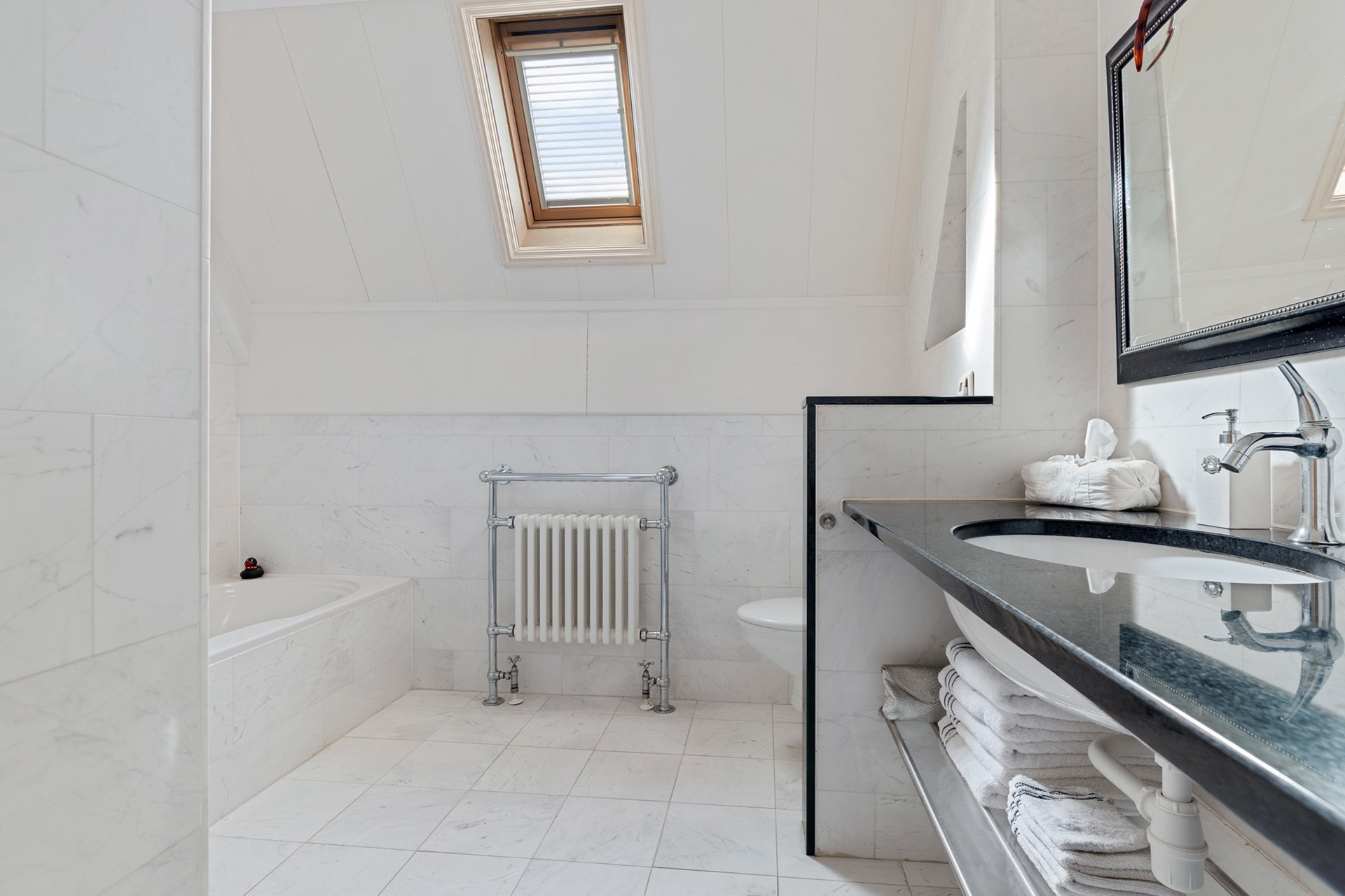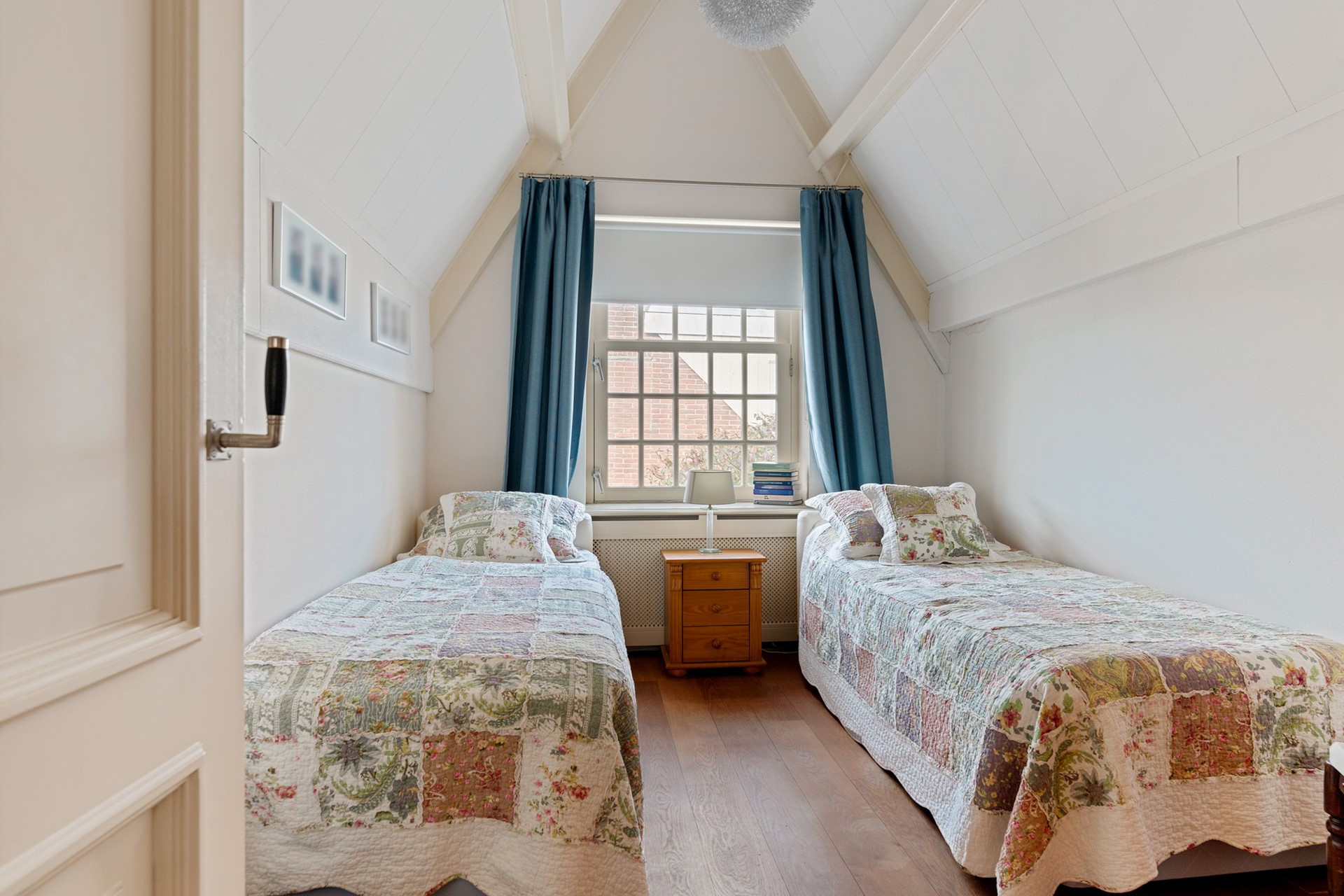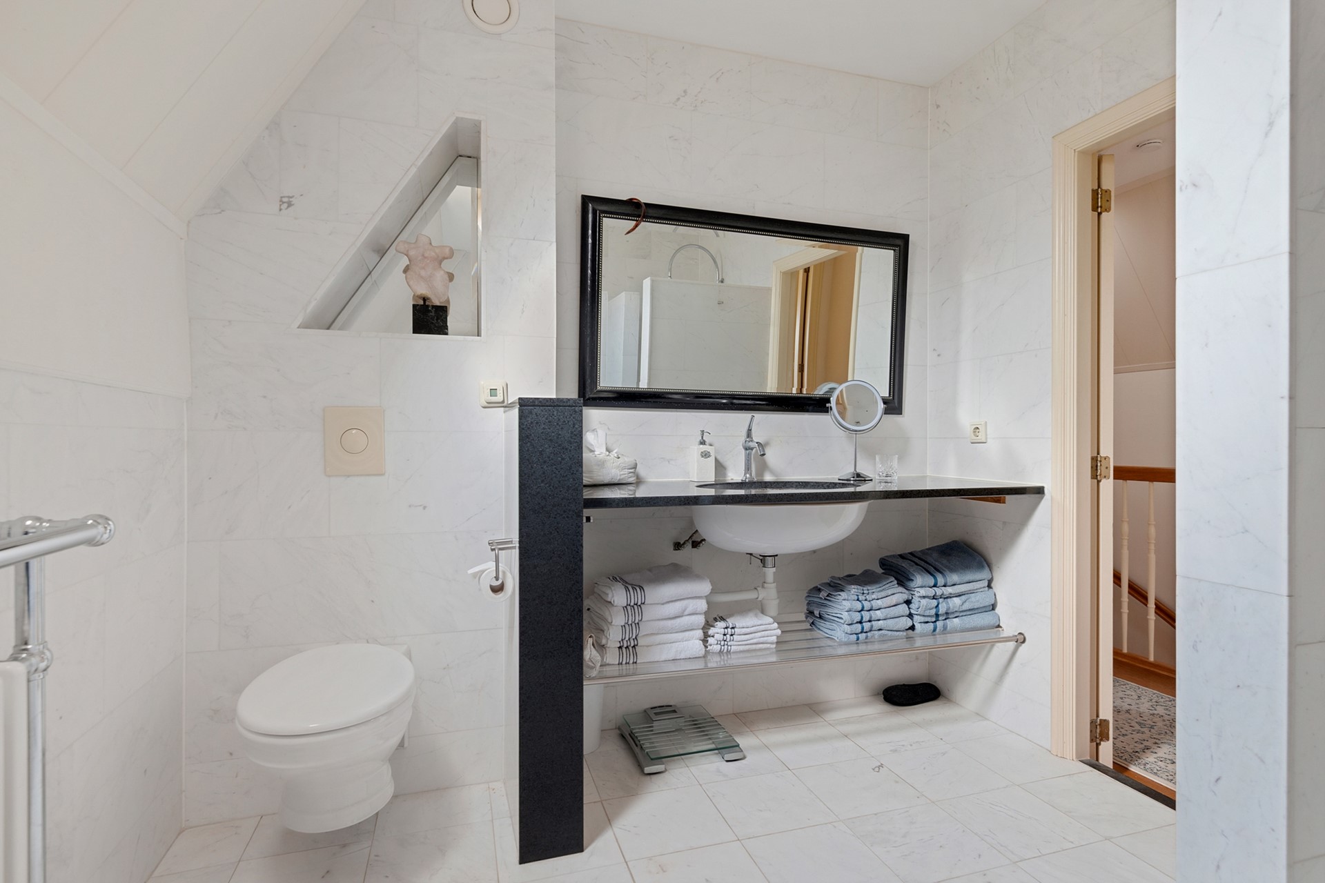 Via de trap in de hal bereik je de vertrekken op de eerste etage. De grootste slaapkamer is aan de voorzijde gelegen. In deze slaapkamer zijn de nok en balken fraai in het zicht gelaten. Over een van de wanden is een flinke kastenwand gemaakt. Al met al een ruimtelijk ogend en prettig slaapverblijf met zicht op de gracht en brug aan de voorzijde. Aan de achterzijde zijn nog twee kamers te vinden. Centraal aan de overloop ligt de badkamer die met marmeren tegels is bekleed. Je vindt hier een wastafel met meubel, een ligbad, tweede toilet en een ruime inloopdouche met stort- en handdouche. Aan de overloop is tot slot nog een aparte ruimte voor wasmachine en droger te vinden. Middels de vlizotrap bereik je vanaf de overloop ook de bovenliggende zolder.