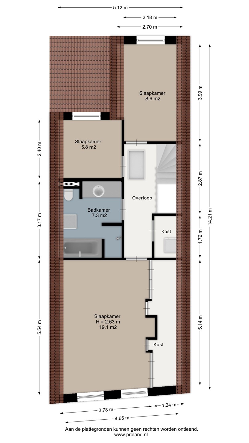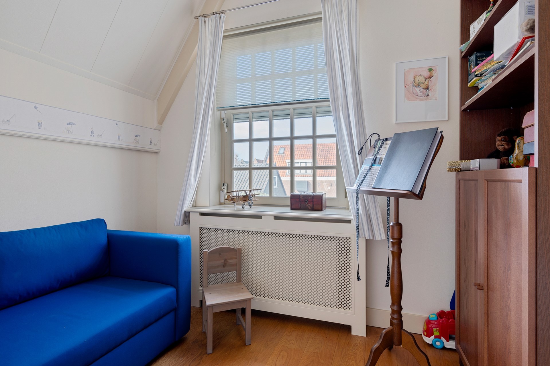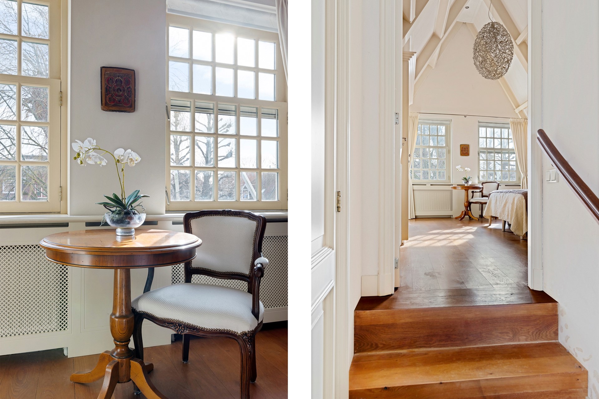 Via de trap in de hal bereik je de vertrekken op de eerste etage. De grootste slaapkamer is aan de voorzijde gelegen. In deze slaapkamer zijn de nok en balken fraai in het zicht gelaten. Over een van de wanden is een flinke kastenwand gemaakt. Al met al een ruimtelijk ogend en prettig slaapverblijf met zicht op de gracht en brug aan de voorzijde. Aan de achterzijde zijn nog twee kamers te vinden. Centraal aan de overloop ligt de badkamer die met marmeren tegels is bekleed. Je vindt hier een wastafel met meubel, een ligbad, tweede toilet en een ruime inloopdouche met stort- en handdouche. Aan de overloop is tot slot nog een aparte ruimte voor wasmachine en droger te vinden. Middels de vlizotrap bereik je vanaf de overloop ook de bovenliggende zolder.