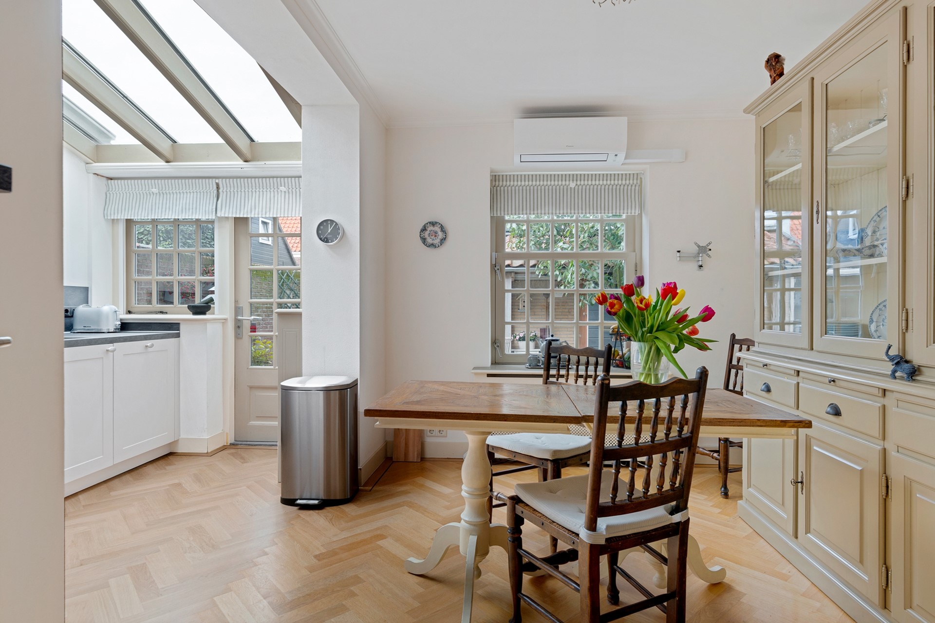 Aan de achterzijde van de woning is de woonkeuken welke in 2025 is vernieuwd die is voorzien van airconditioning. Ook hier is prettig veel daglichttoetreding. De keuken is gebouwd in L-opstelling en beschikt over diverse inbouwapparatuur waaronder een oven, inductiekookplaat met geïntegreerde afzuiging, koelkast en vaatwasser. Vanuit de keuken bereik je de knusse stadstuintje die op het noordwesten gelegen is.
