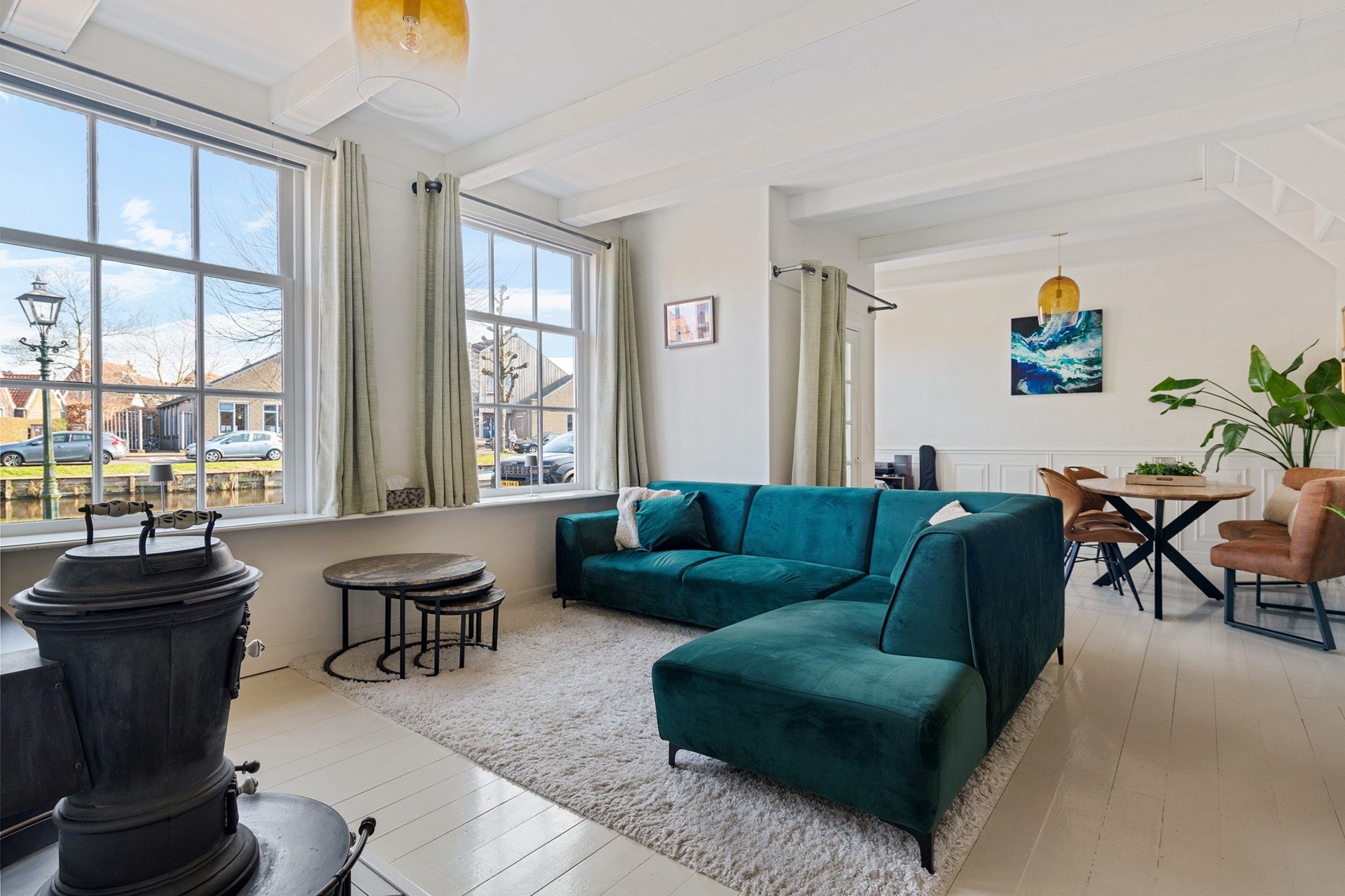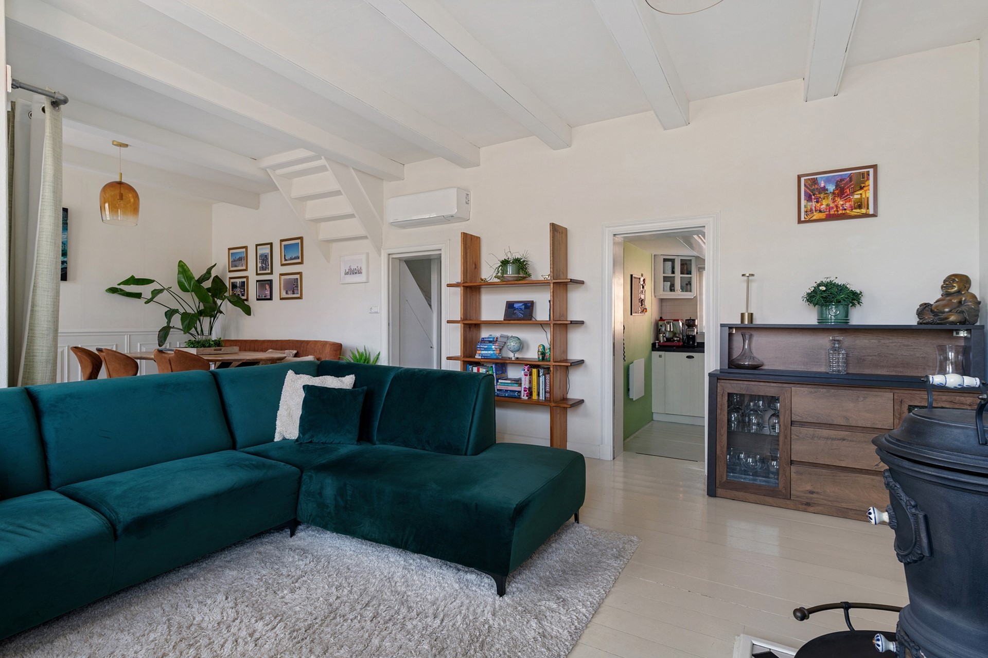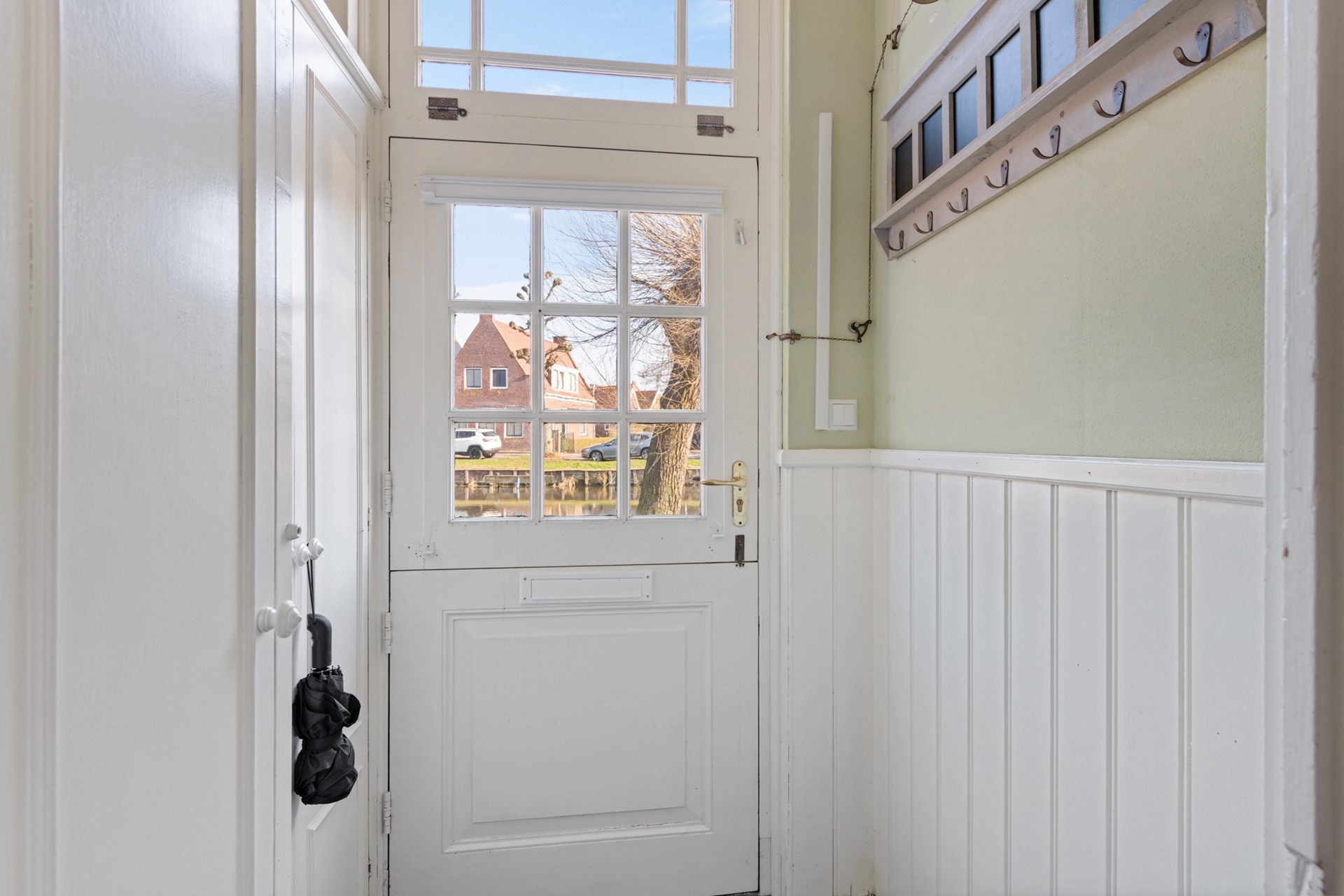De voordeur met kantelbaar bovenlicht bevindt zich in het midden van het pand. Via de hal met tussendeur betreedt je de ruime woonkamer die over de gehele voorzijde van de woning gelegen is. Deze kamer is bijzonder licht door de grote schuiframen met roeden, die uitzicht bieden op de gracht. Authentieke details, zoals de witgeschilderde houten vloer, de houten lambrisering, het plafond met balken en de gietijzeren houtkachel geven de ruimte extra sfeer. Voor extra wooncomfort is er recent airconditioning geïnstalleerd in de woonkamer.