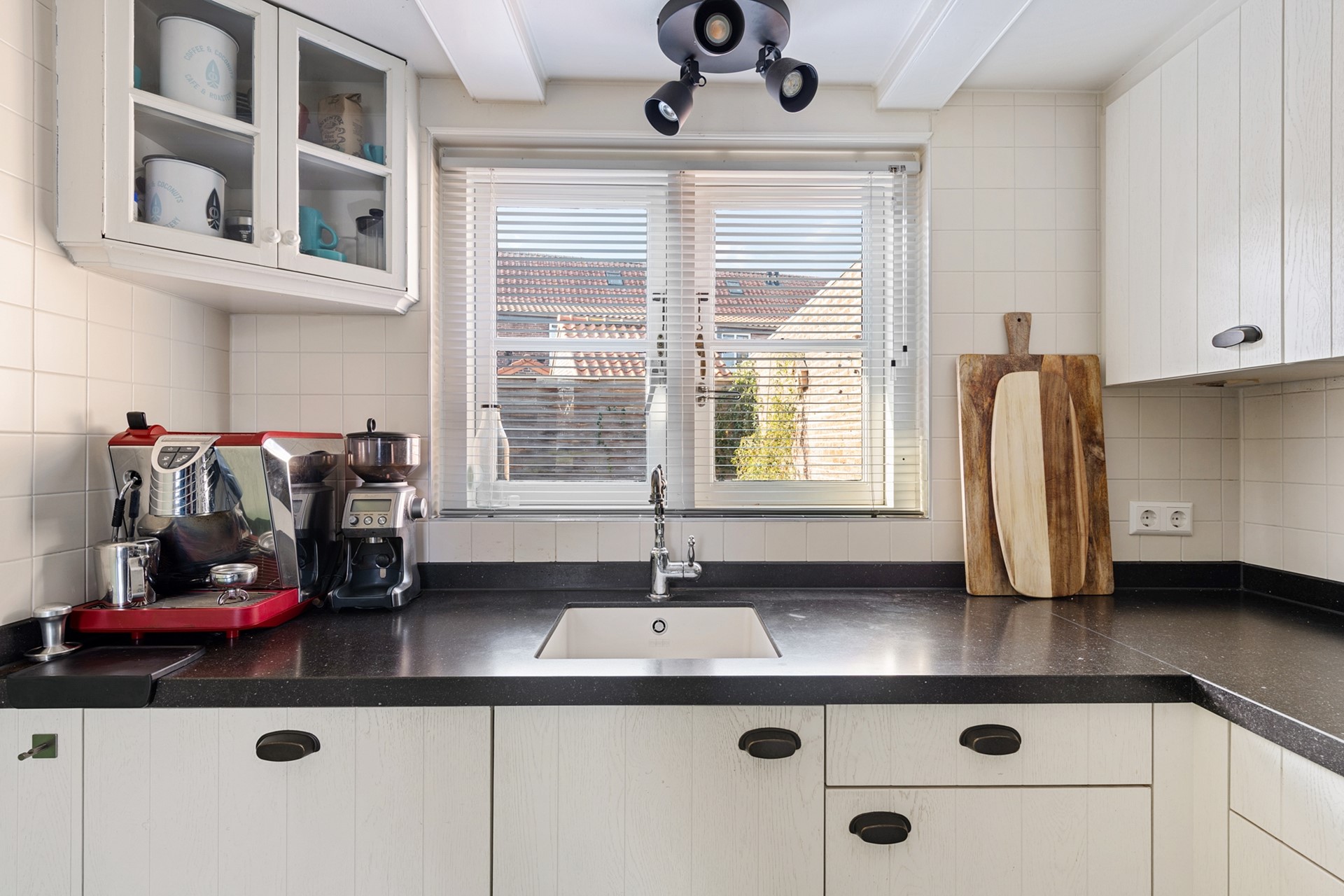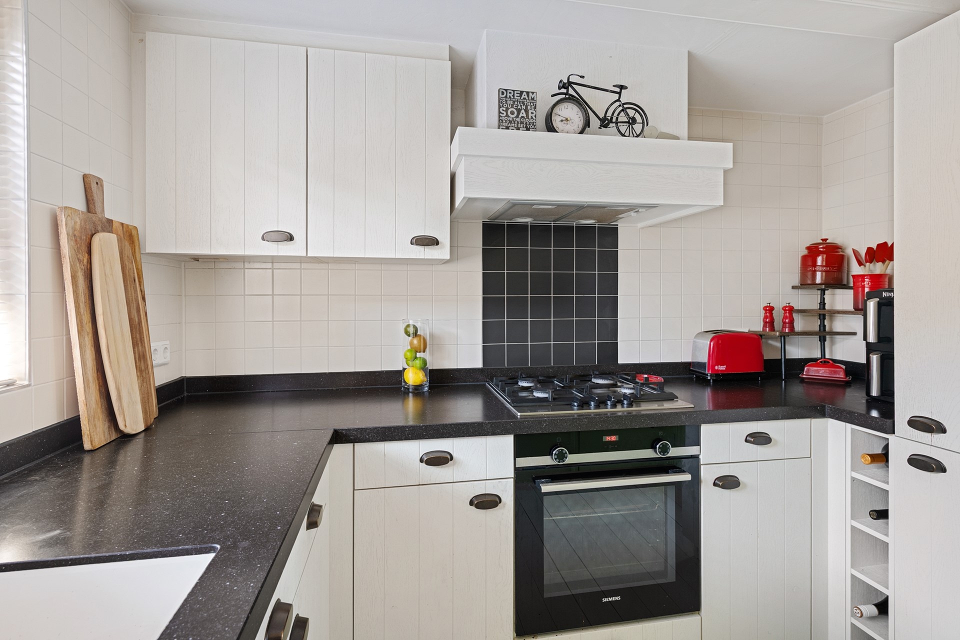 Via de woonkamer betreed je de aangebouwde halfopen keuken die is opgesteld in L-vorm en uitzicht biedt op de achtertuin. De moderne keuken is voorzien van ingebouwde vaatwasser, oven, 4-pits gasfornuis en afzuigkap en een koel/vriescombinatie. Er is daarnaast een handige voorraadkast.