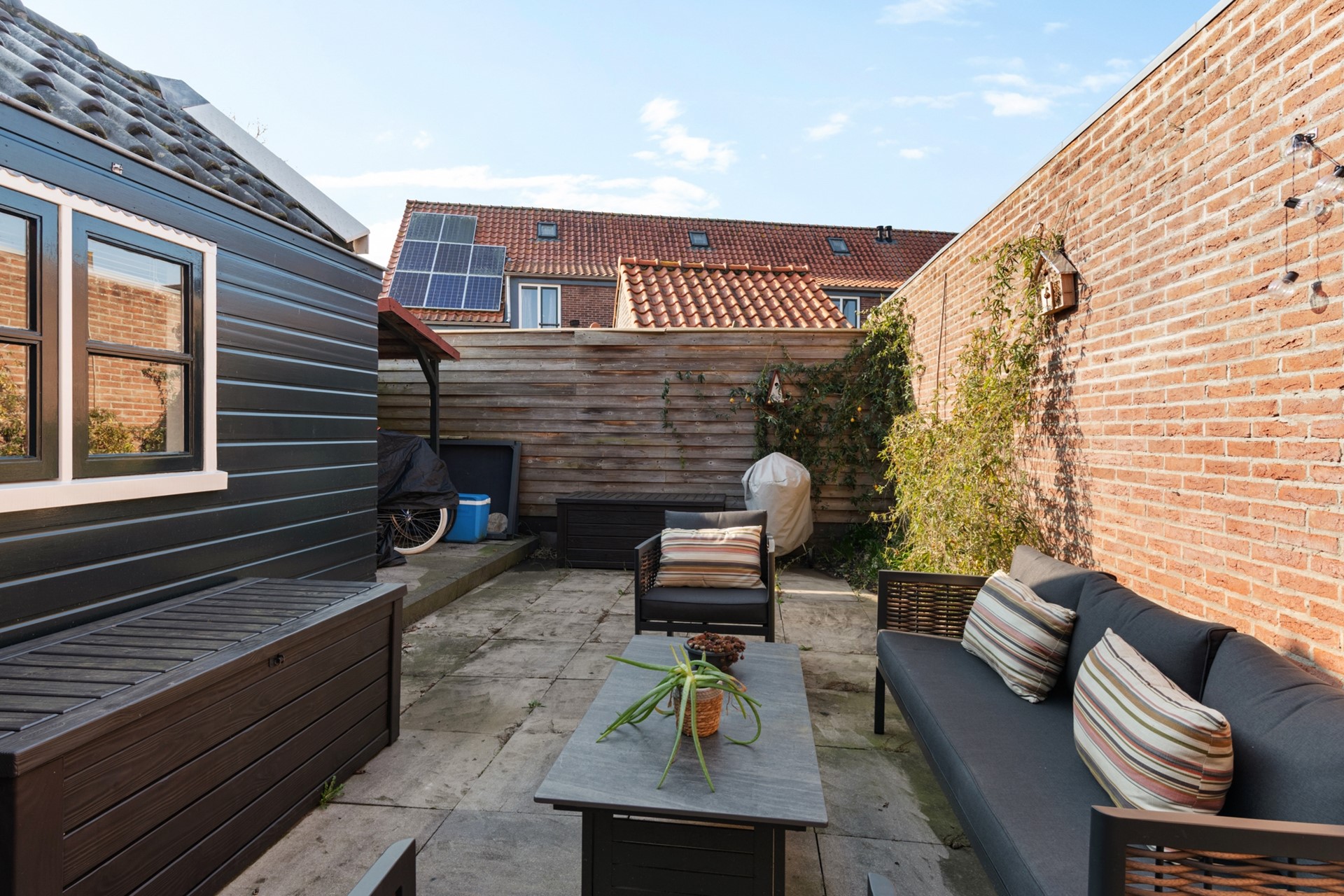 De woning is aan de voorzijde voorzien van een eigen stoep met konkelbankje. Een heerlijk plekje om een praatje te maken met de buren en te genieten van het uitzicht op de rustige straat en de Binnendijk. Aan de achterzijde is de besloten tuin op het westen gelegen. Een heerlijke stadstuin waar je van kunt genieten tot de zon ondergaat. In de achtertuin bevindt zich achter de uitbouw ook een afdak om tuinspullen droog te stallen.