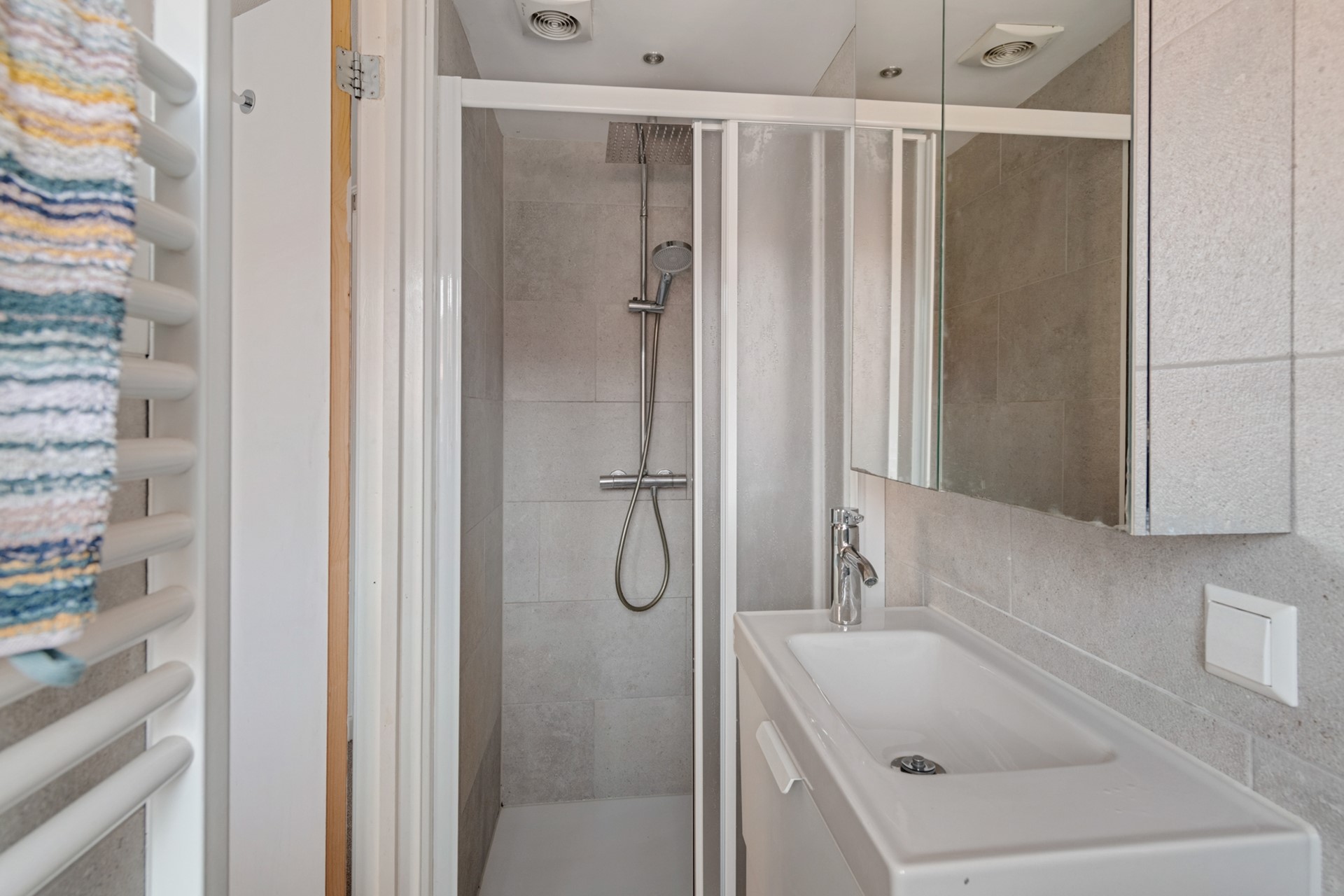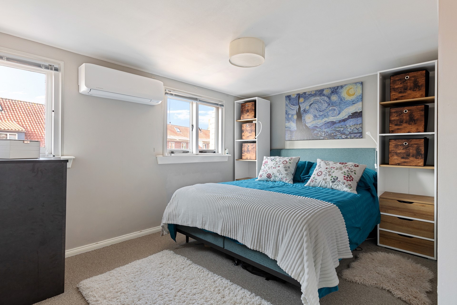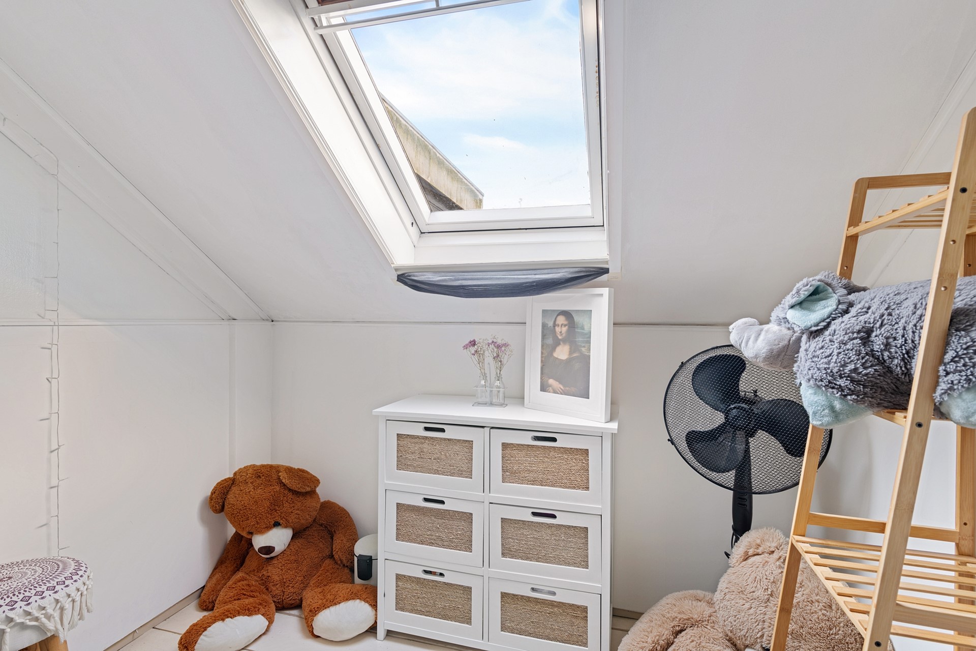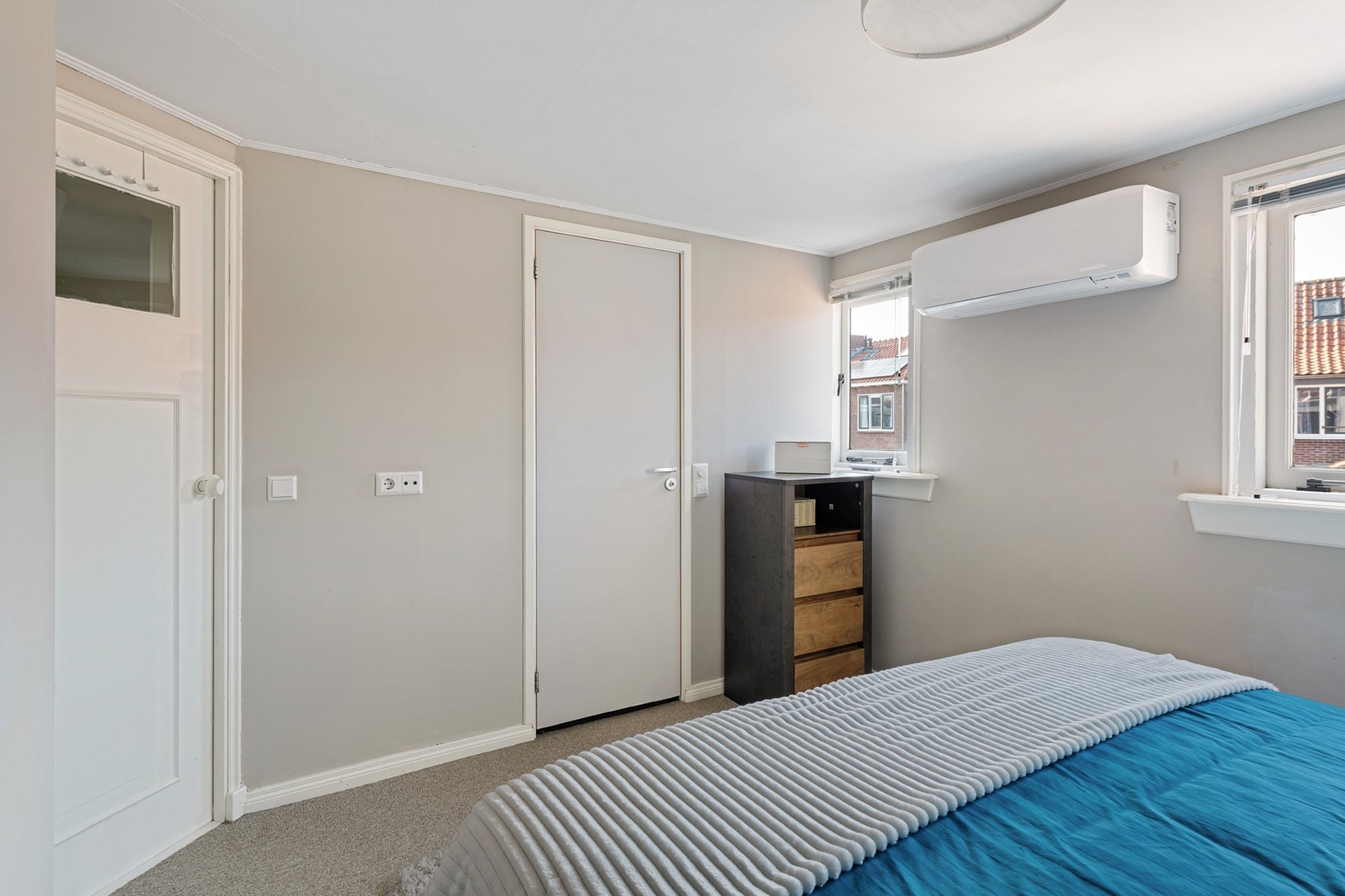 Aan de achterzijde bevindt zich een tweede ruime slaapkamer met rechte wanden. Deze kamer is recent voorzien van airconditioning en geeft directe toegang tot de moderne badkamer die is voorzien van wastafel, tweede toilet en inloopdouche met regen- en handdouche. Vervolgens is er nog een kleinere slaapkamer met praktische bergruimte achter de knieschotten, die is voorzien van een groot dakraam. De ruimte in dit huis is optimaal benut, want tussen de begane grond en eerste verdieping is prettig veel opbergruimte gerealiseerd.