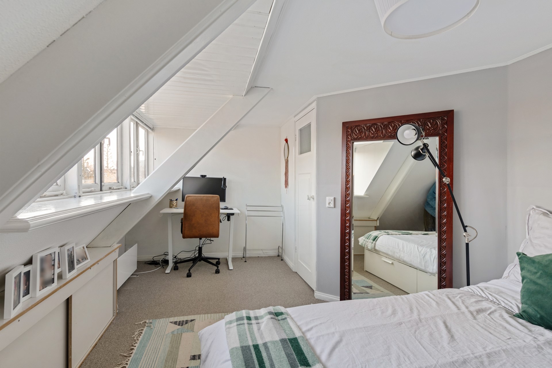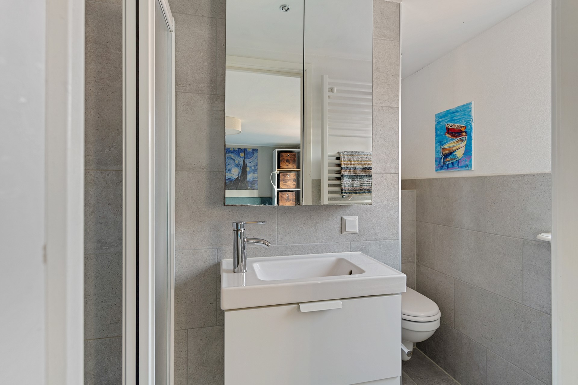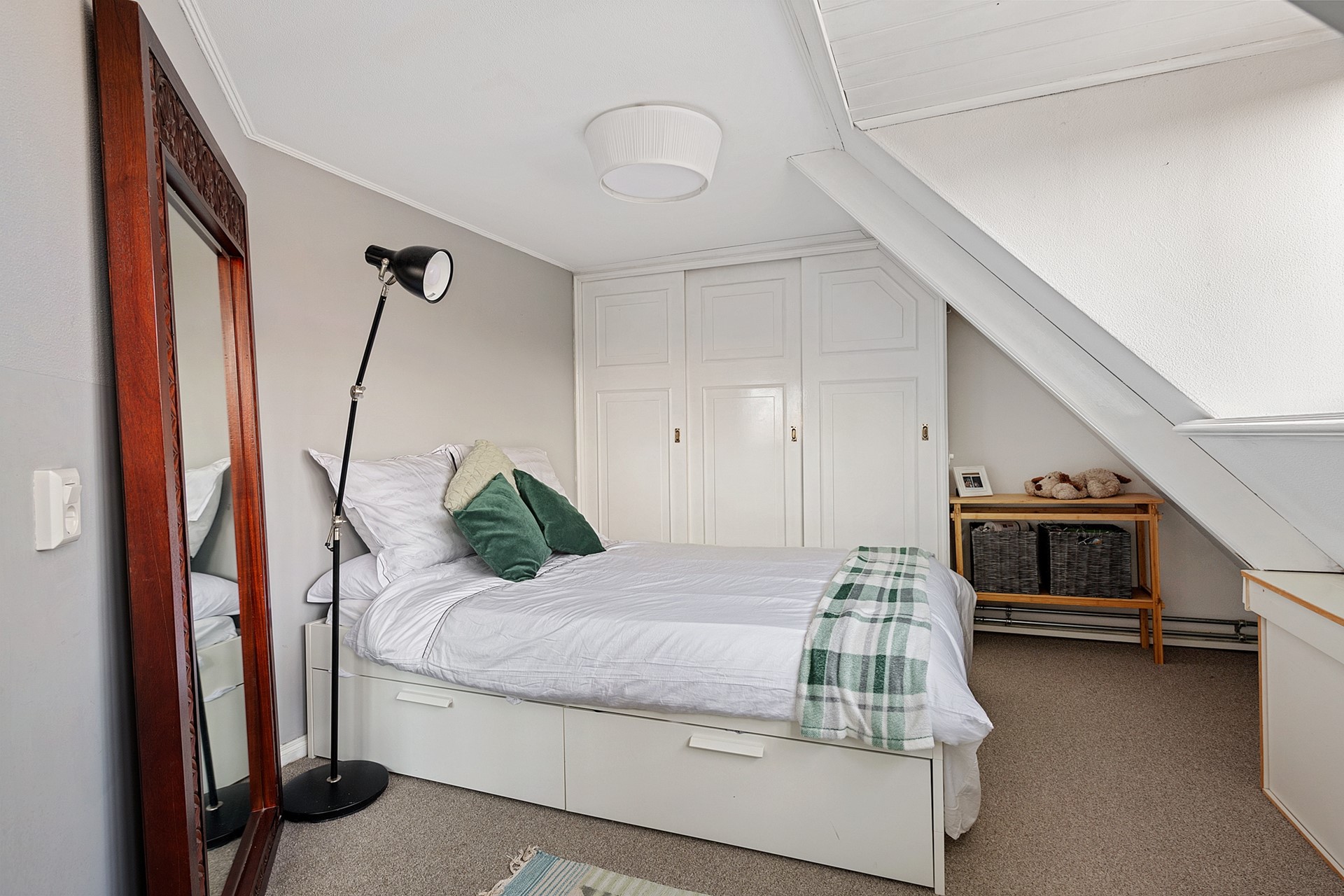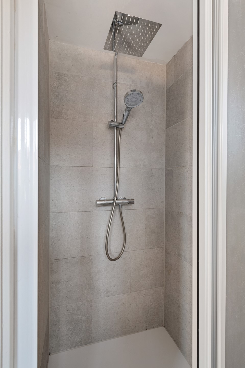 Aan de achterzijde bevindt zich een tweede ruime slaapkamer met rechte wanden. Deze kamer is recent voorzien van airconditioning en geeft directe toegang tot de moderne badkamer die is voorzien van wastafel, tweede toilet en inloopdouche met regen- en handdouche. Vervolgens is er nog een kleinere slaapkamer met praktische bergruimte achter de knieschotten, die is voorzien van een groot dakraam. De ruimte in dit huis is optimaal benut, want tussen de begane grond en eerste verdieping is prettig veel opbergruimte gerealiseerd.