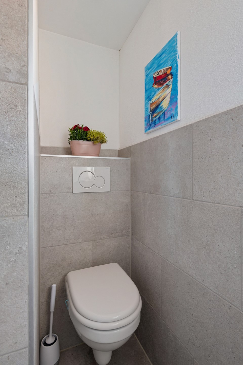 De nette badkamer met wastafel, toilet en douche, is aan de naastgelegen hal te vinden. Aan deze hal vind je ook de trapopgang en er is ruimte voor de vernieuwde meterkast en een wasruimte met daarin eveneens de Cv-installatie. Vanuit de hal stap je bovendien de besloten achtertuin op het westen in. Tot slot is er in de uitbouw nog een kamer gerealiseerd die nu dienst doet als kantoor. In de punt van deze aanbouw is prettig veel bergruimte.