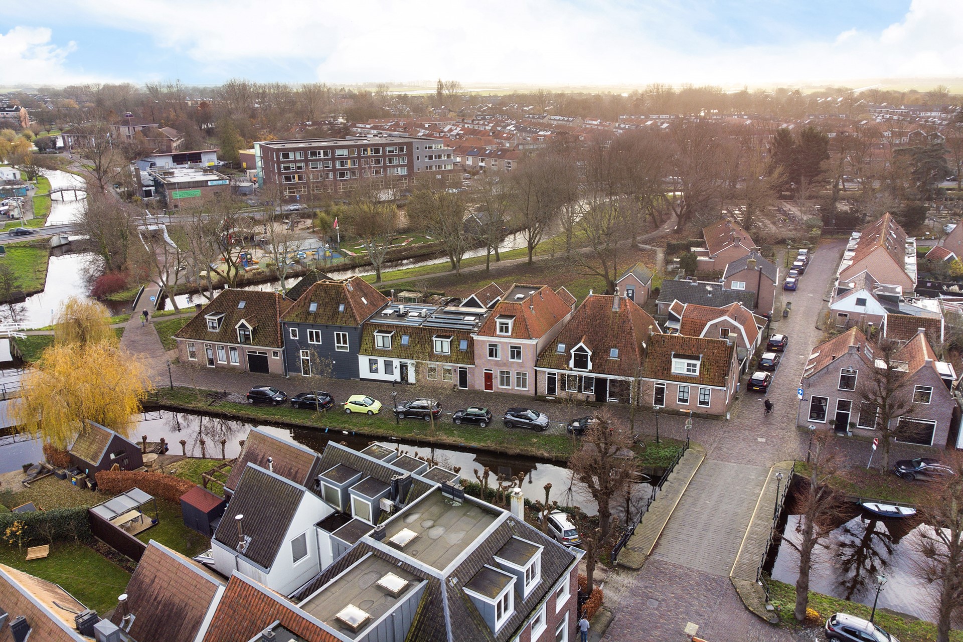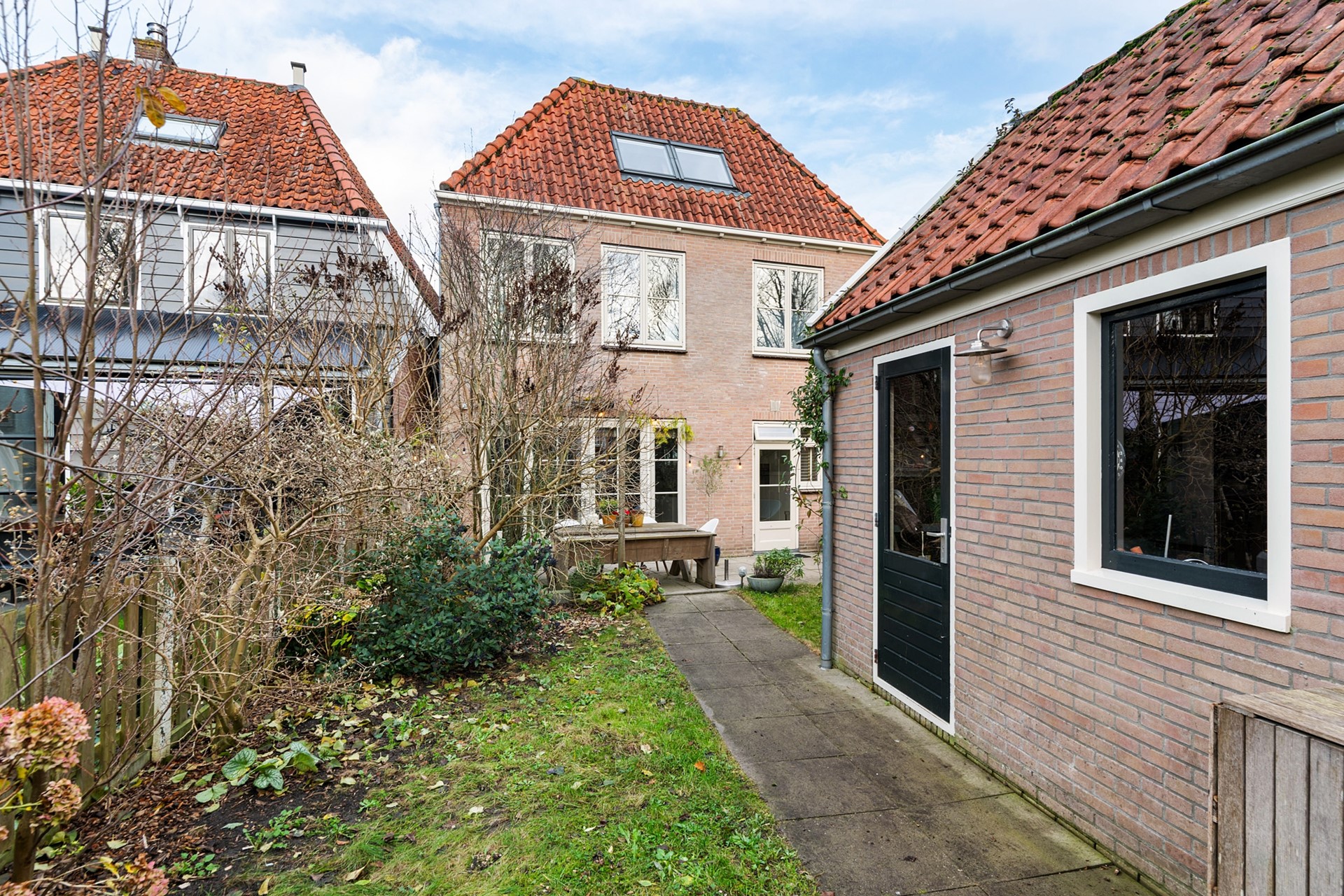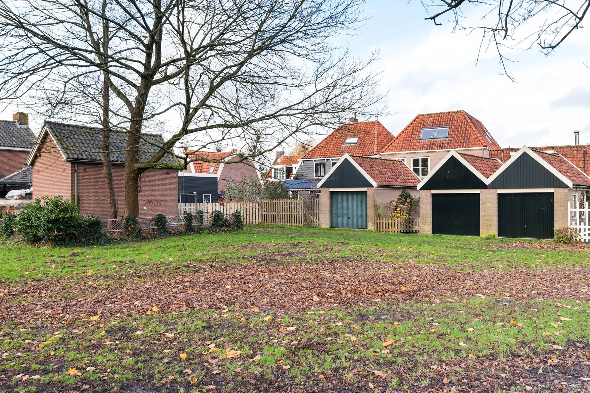 Aan de voorzijde van de woning, gelegen op het noordoosten, kun je op de eigen stoep heerlijk op een bankje over de gracht uitkijken. Doordat de woning aan een doodlopende straat ligt, is het hier nooit druk met verkeer voor de deur. Parkeren kan (met vergunning) direct voor de deur en het is mogelijk om een bootje in de gracht te leggen, om zo Waterland vanaf het water te verkennen. Aan de achterzijde bevindt zich de besloten stadstuin op het zuidwesten. Direct aan het huis, bij de openslaande tuindeuren, is een fijn terras gemaakt. De rest van de tuin is voorzien van gras en groene borders. Achterin de tuin ligt de vrijstaande stenen garage, voorzien van elektra. Door het puntdak is er extra bergruimte in de nok, die bereikbaar is middels een vlizotrap. Aan de achterzijde loopt een privé pad, dat alleen toegankelijk is voor de bewoners van deze huizen en bedoeld is om de garage en de achtertuin te kunnen bereiken. Tevens kan men hier altijd de auto parkeren voor de garage.
