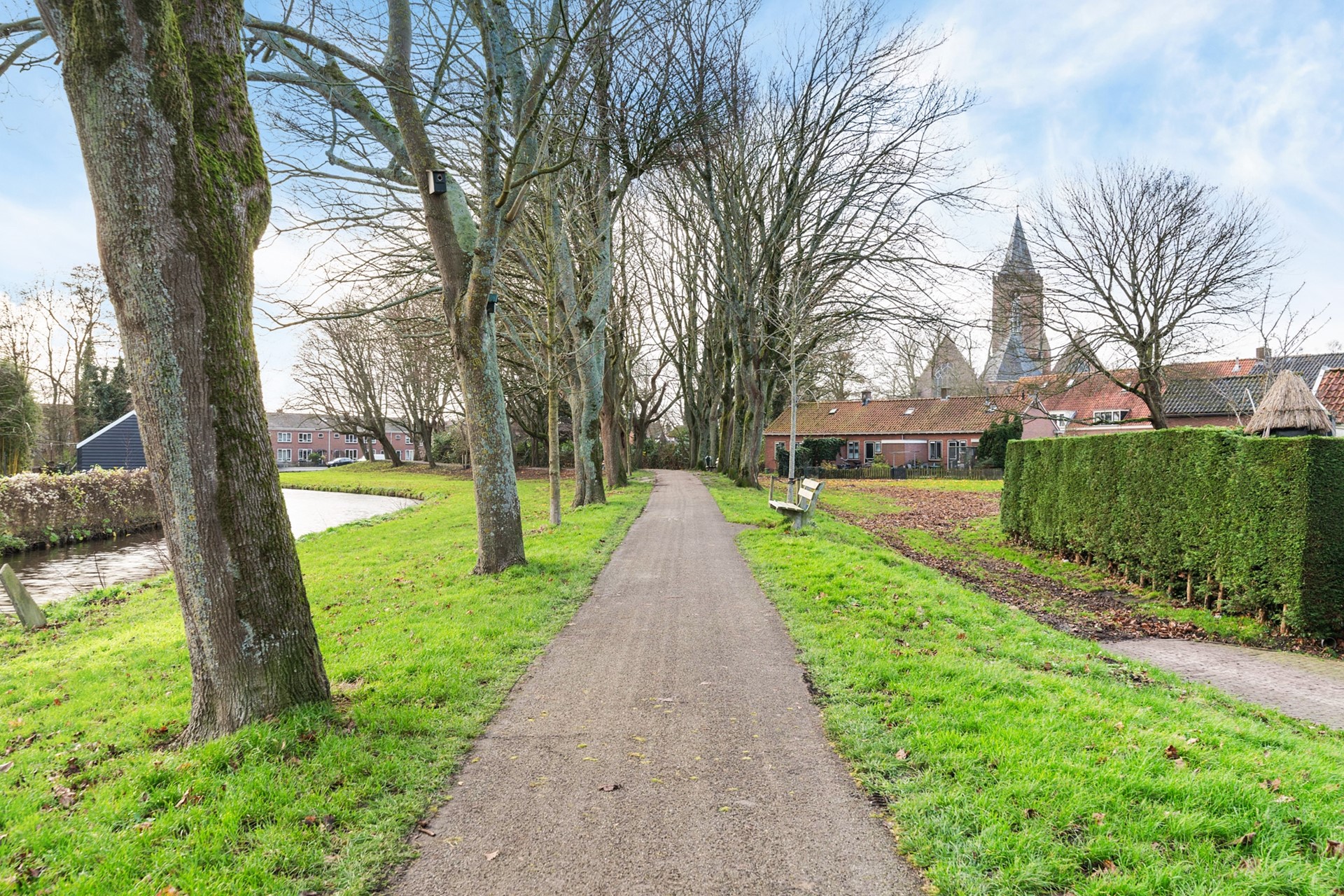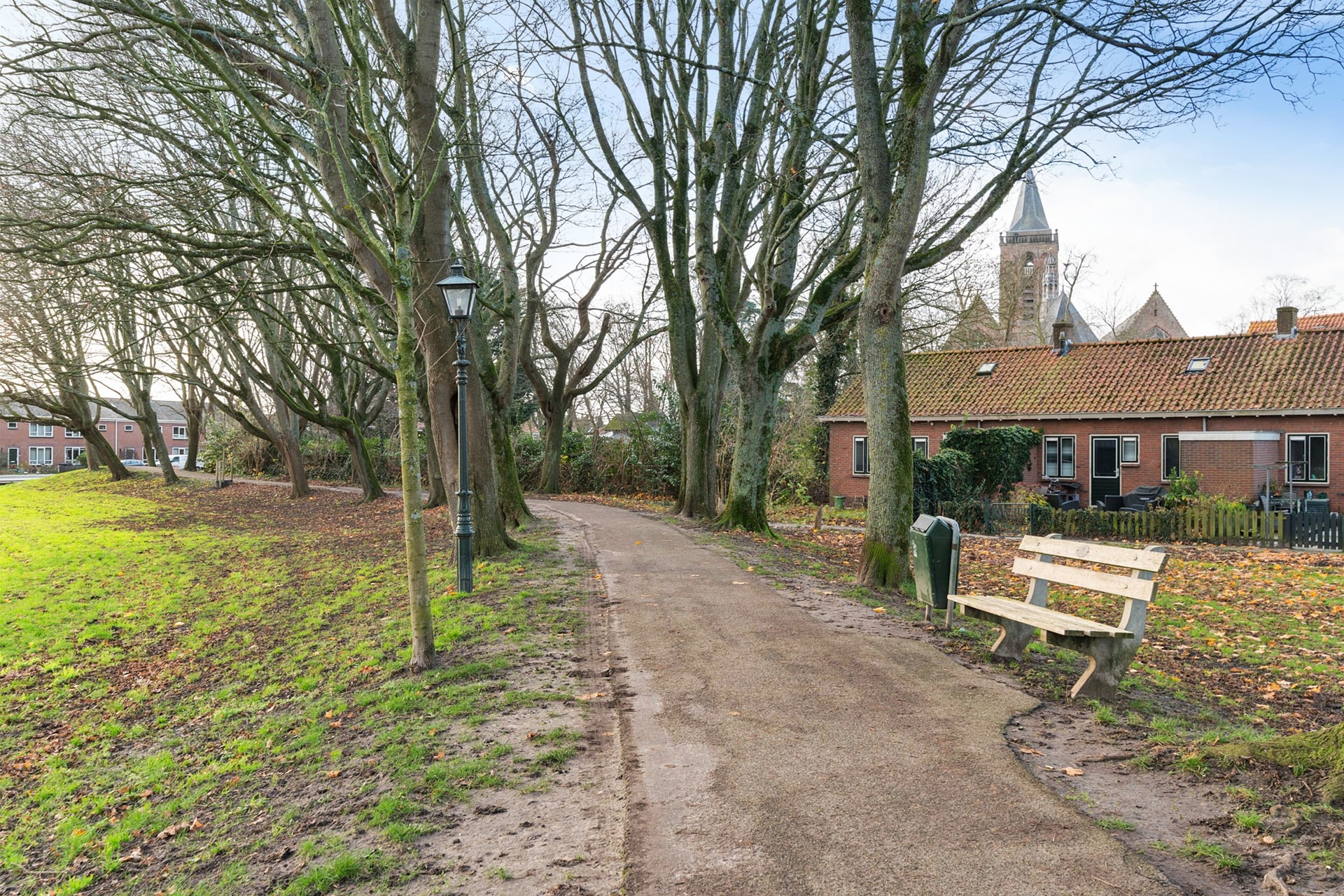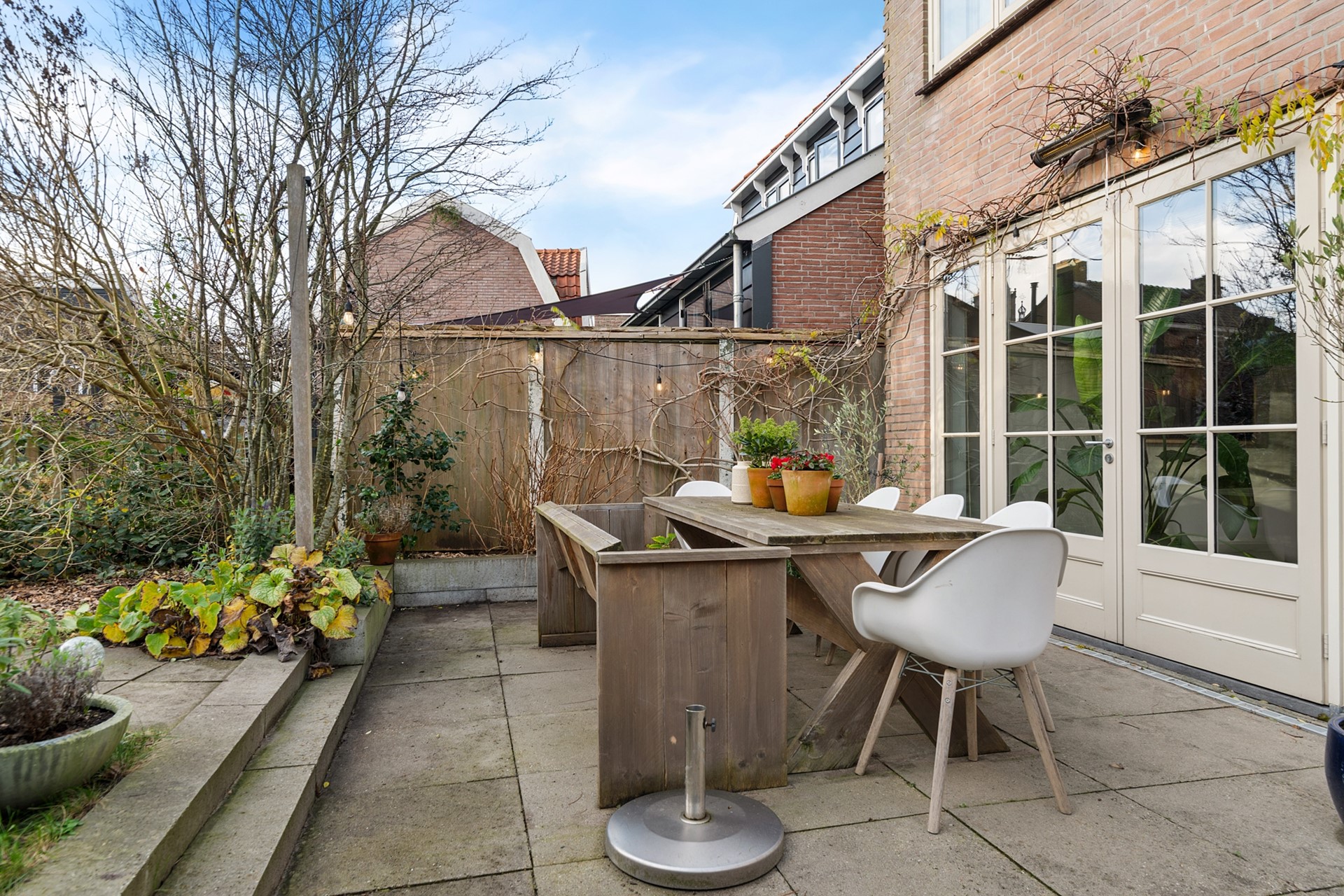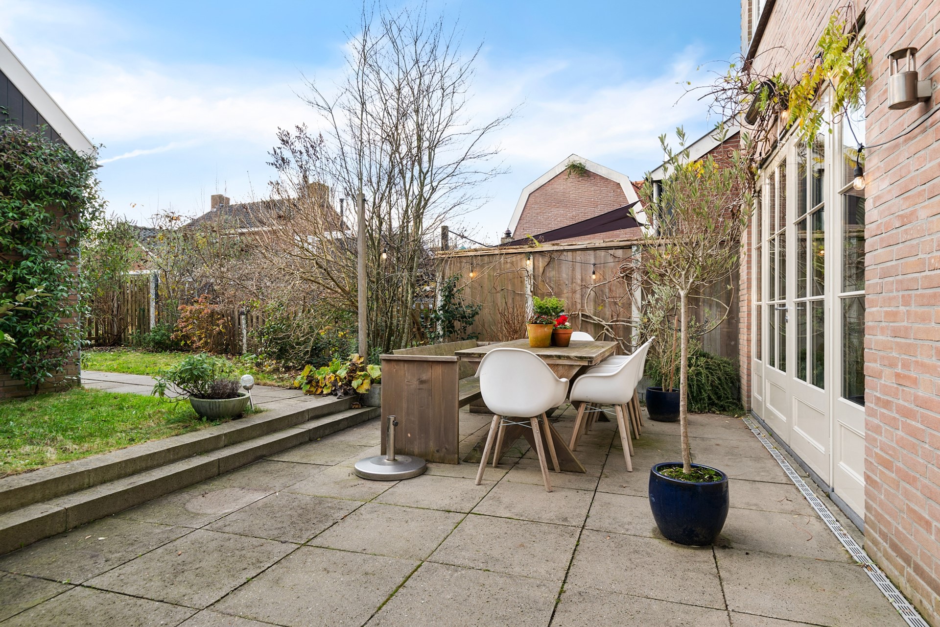 Aan de voorzijde van de woning, gelegen op het noordoosten, kun je op de eigen stoep heerlijk op een bankje over de gracht uitkijken. Doordat de woning aan een doodlopende straat ligt, is het hier nooit druk met verkeer voor de deur. Parkeren kan (met vergunning) direct voor de deur en het is mogelijk om een bootje in de gracht te leggen, om zo Waterland vanaf het water te verkennen. Aan de achterzijde bevindt zich de besloten stadstuin op het zuidwesten. Direct aan het huis, bij de openslaande tuindeuren, is een fijn terras gemaakt. De rest van de tuin is voorzien van gras en groene borders. Achterin de tuin ligt de vrijstaande stenen garage, voorzien van elektra. Door het puntdak is er extra bergruimte in de nok, die bereikbaar is middels een vlizotrap. Aan de achterzijde loopt een privé pad, dat alleen toegankelijk is voor de bewoners van deze huizen en bedoeld is om de garage en de achtertuin te kunnen bereiken. Tevens kan men hier altijd de auto parkeren voor de garage.