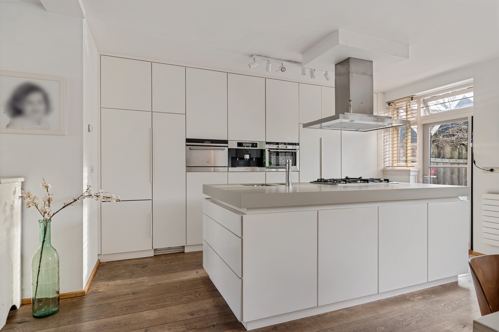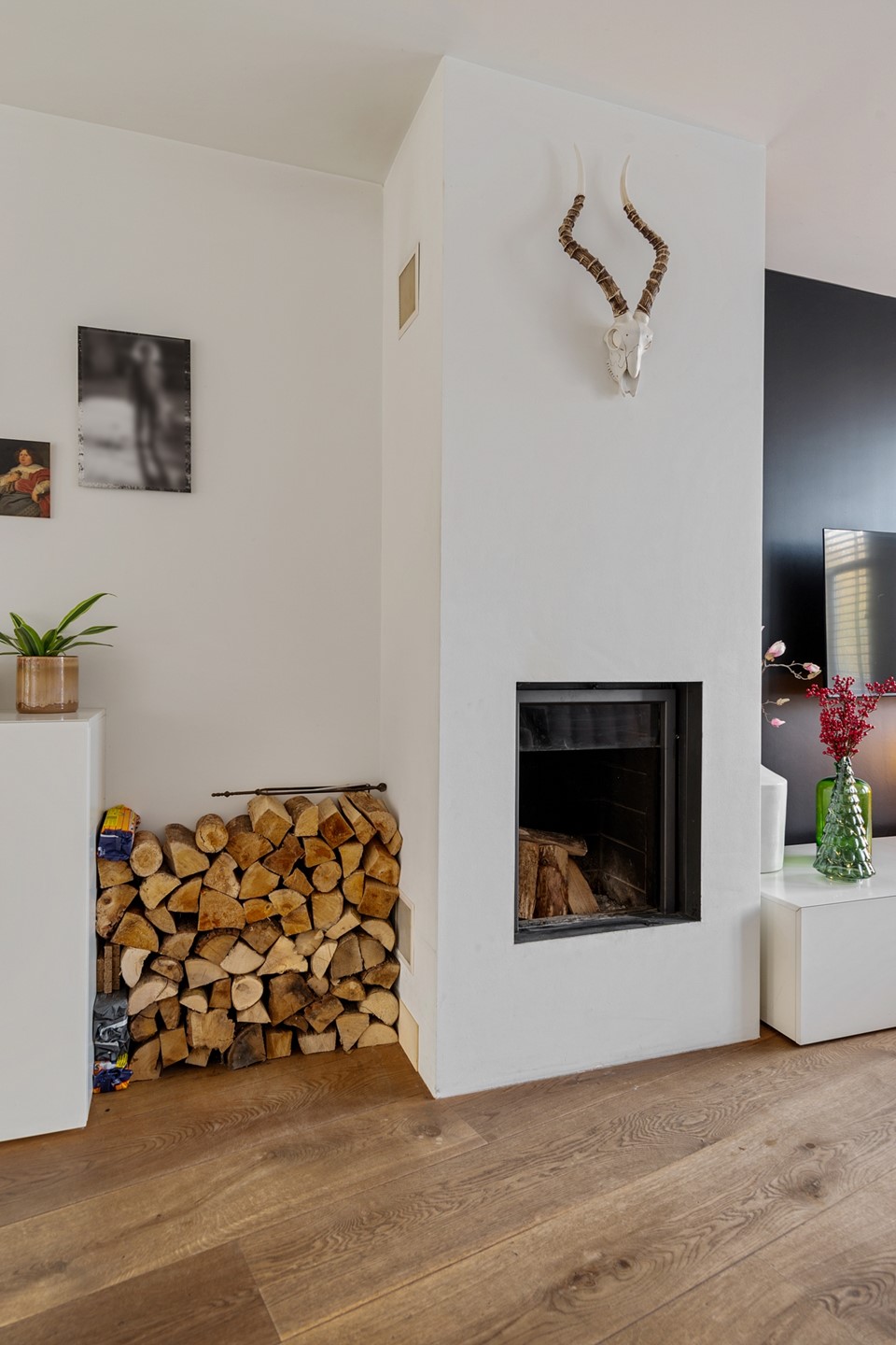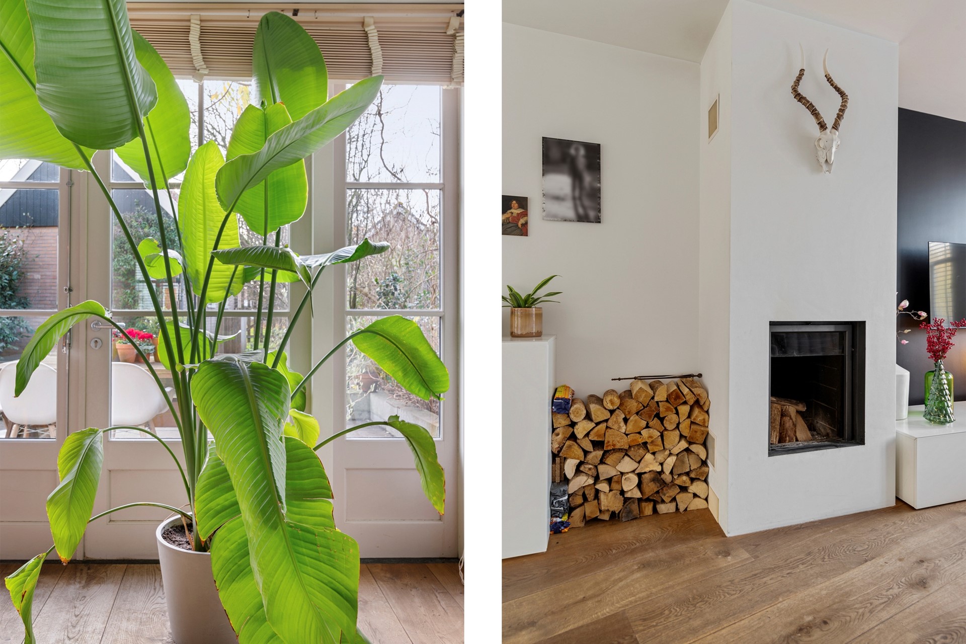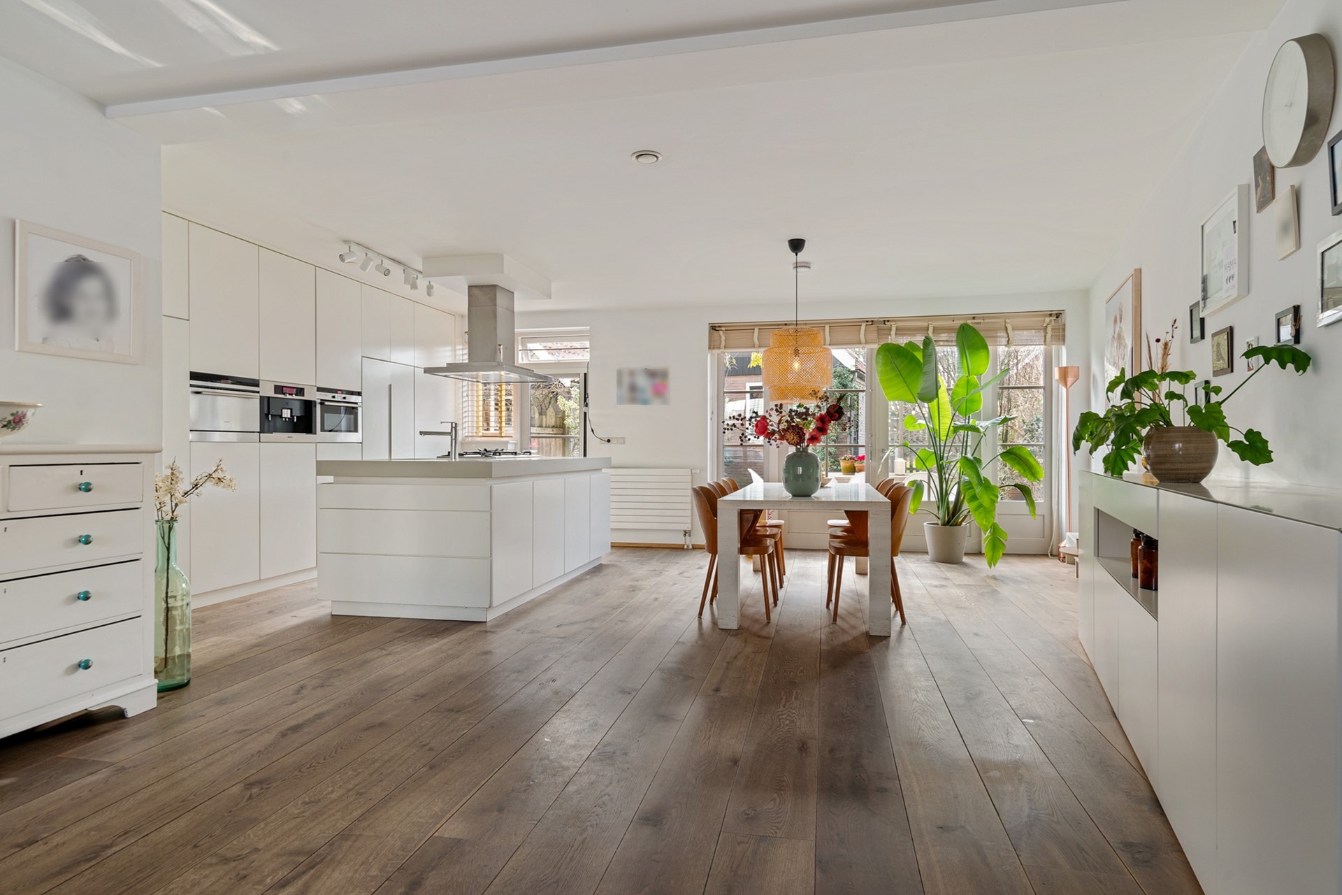 Na de royale entree met meterkast, trapopgang en moderne toiletruimte met fonteintje, stap je de woonkamer in, die naar de achterzijde toe schuin wegloopt. Dit maakt de kamer niet alleen speels, maar ook lekker ruim! Aan de voorzijde is alle ruimte voor een gezellige zithoek bij de openhaard met zicht op de rustige straat en gracht. Aan de achterzijde, bij de openslaande deuren naar de achtertuin, vindt het hele gezin een plekje aan de grote eettafel. Direct daarnaast is de royale open keuken met kook- en spoeleiland. De moderne keuken, in wit uitgevoerd, is voorzien van diverse inbouwapparatuur, waaronder 5-pits gasfornuis, vaatwasser, koelkast, oven en koffiemachine en biedt praktisch veel bergruimte. Extra bergruimte is handig weggewerkt. Via de deur in de keukenwand bereik je je eigen kelder met een stahoogte van 1.92 meter. Altijd al een wijnkelder willen hebben? Dan is dit je kans!