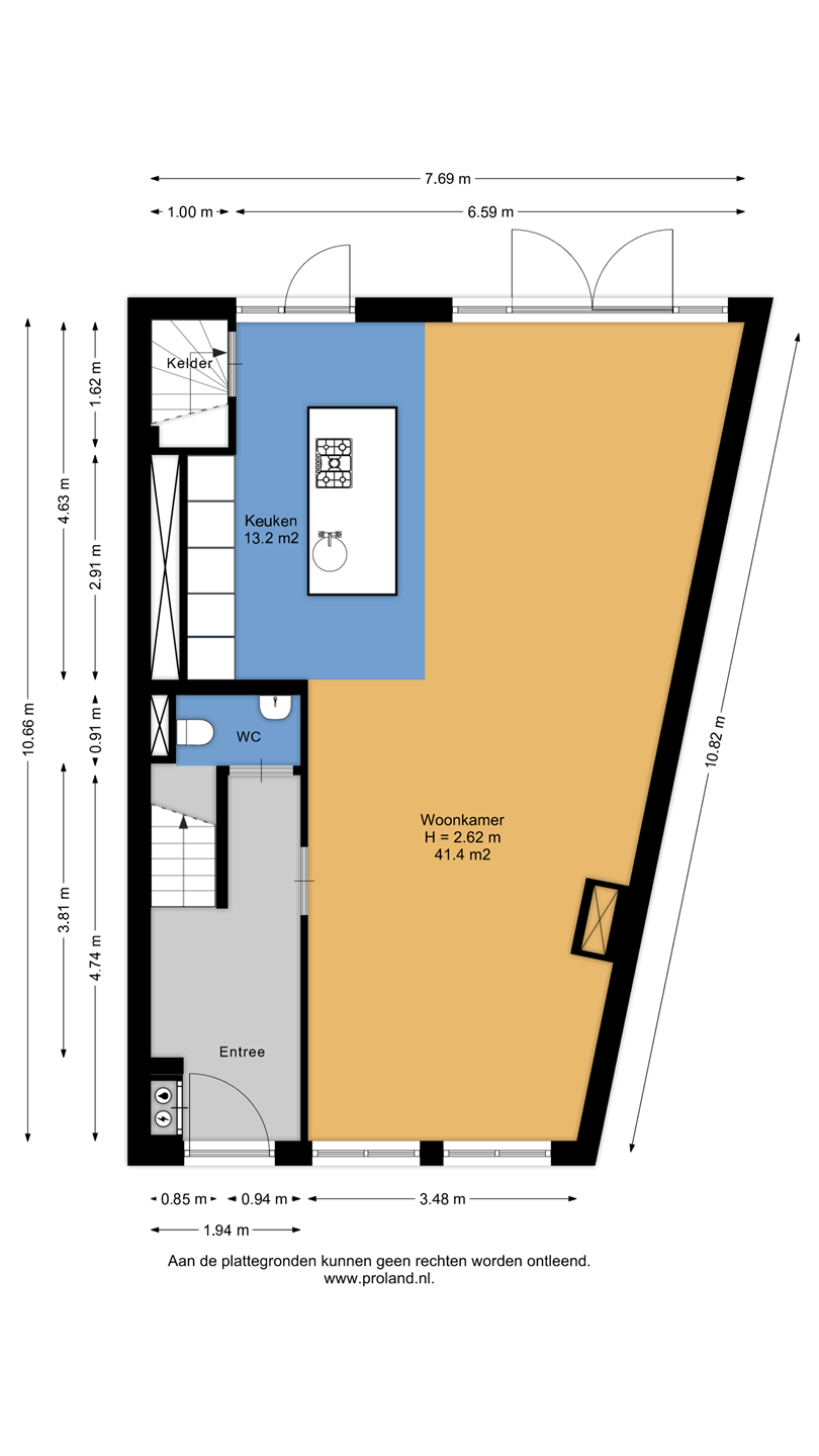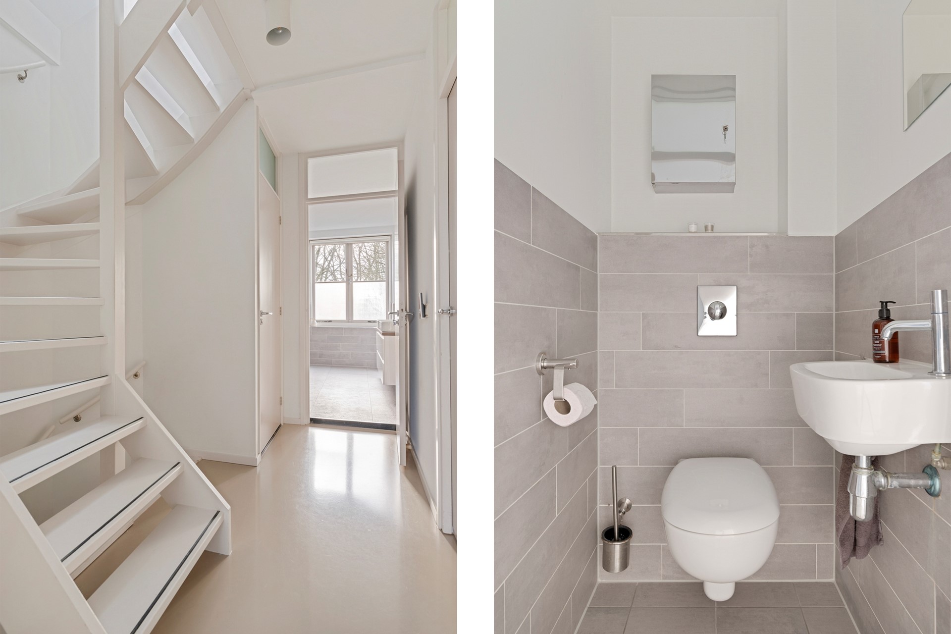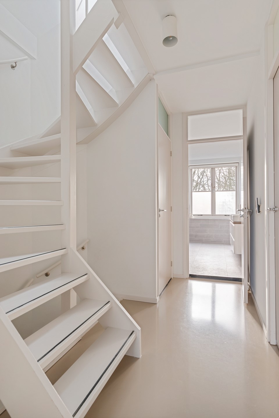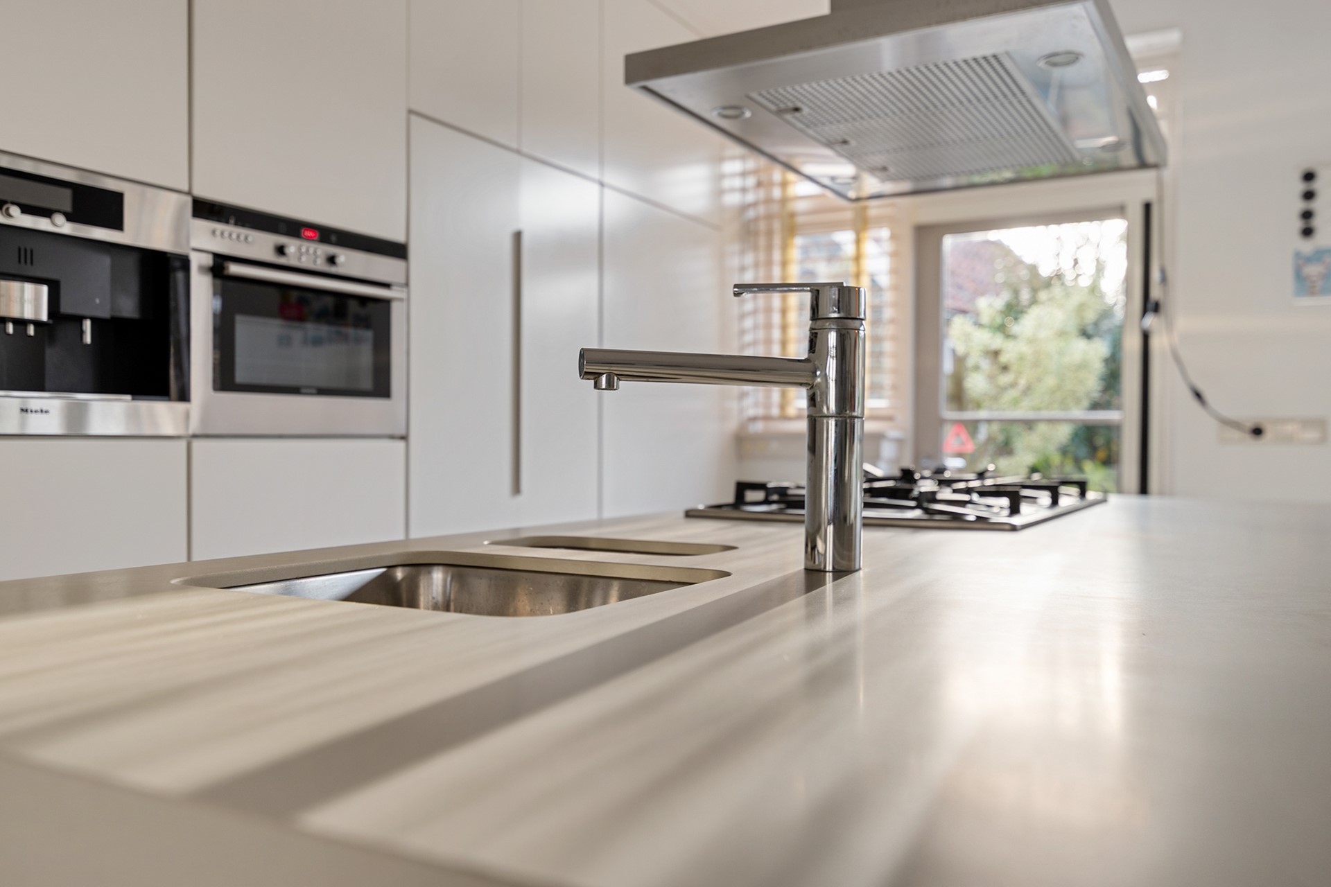 Na de royale entree met meterkast, trapopgang en moderne toiletruimte met fonteintje, stap je de woonkamer in, die naar de achterzijde toe schuin wegloopt. Dit maakt de kamer niet alleen speels, maar ook lekker ruim! Aan de voorzijde is alle ruimte voor een gezellige zithoek bij de openhaard met zicht op de rustige straat en gracht. Aan de achterzijde, bij de openslaande deuren naar de achtertuin, vindt het hele gezin een plekje aan de grote eettafel. Direct daarnaast is de royale open keuken met kook- en spoeleiland. De moderne keuken, in wit uitgevoerd, is voorzien van diverse inbouwapparatuur, waaronder 5-pits gasfornuis, vaatwasser, koelkast, oven en koffiemachine en biedt praktisch veel bergruimte. Extra bergruimte is handig weggewerkt. Via de deur in de keukenwand bereik je je eigen kelder met een stahoogte van 1.92 meter. Altijd al een wijnkelder willen hebben? Dan is dit je kans!