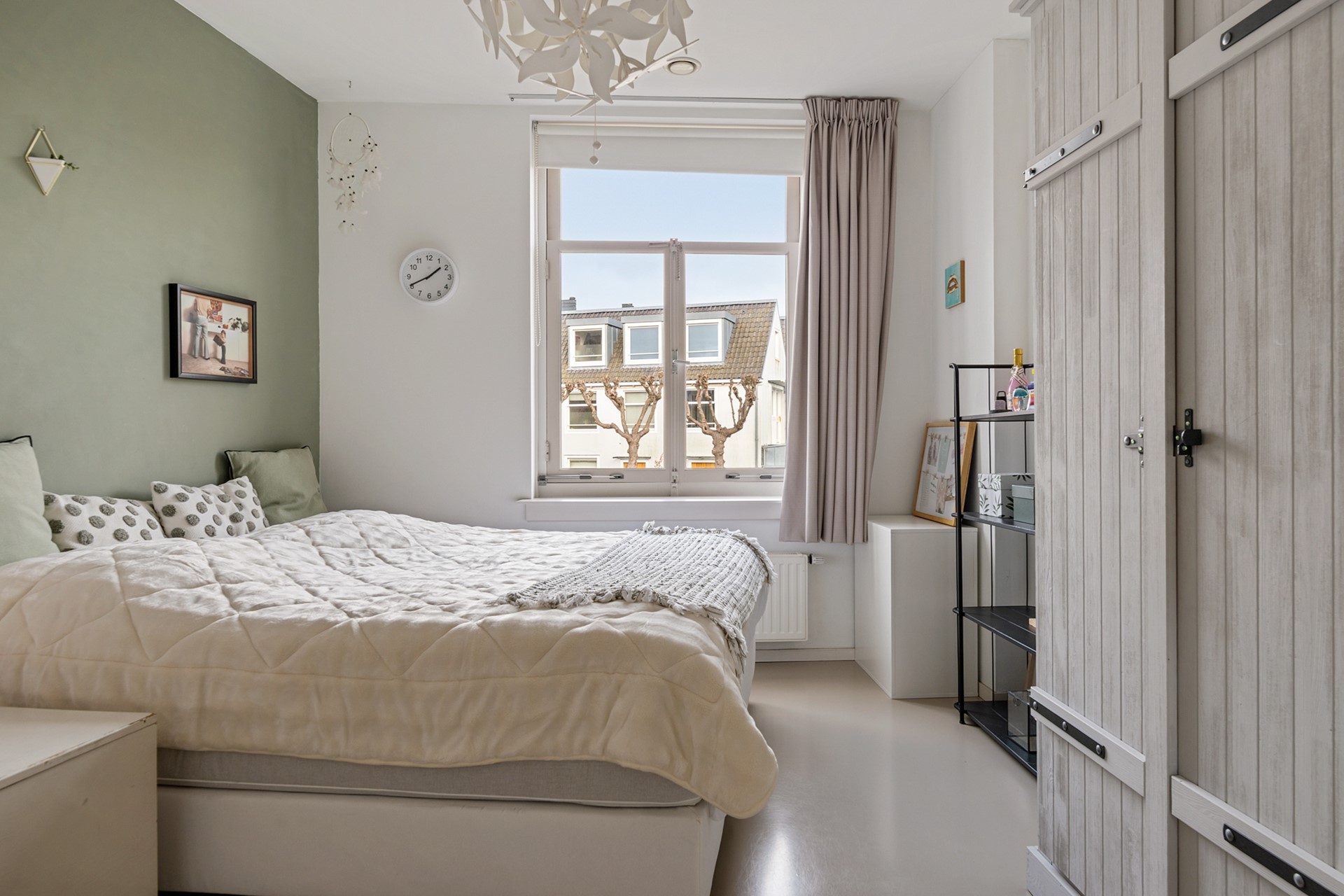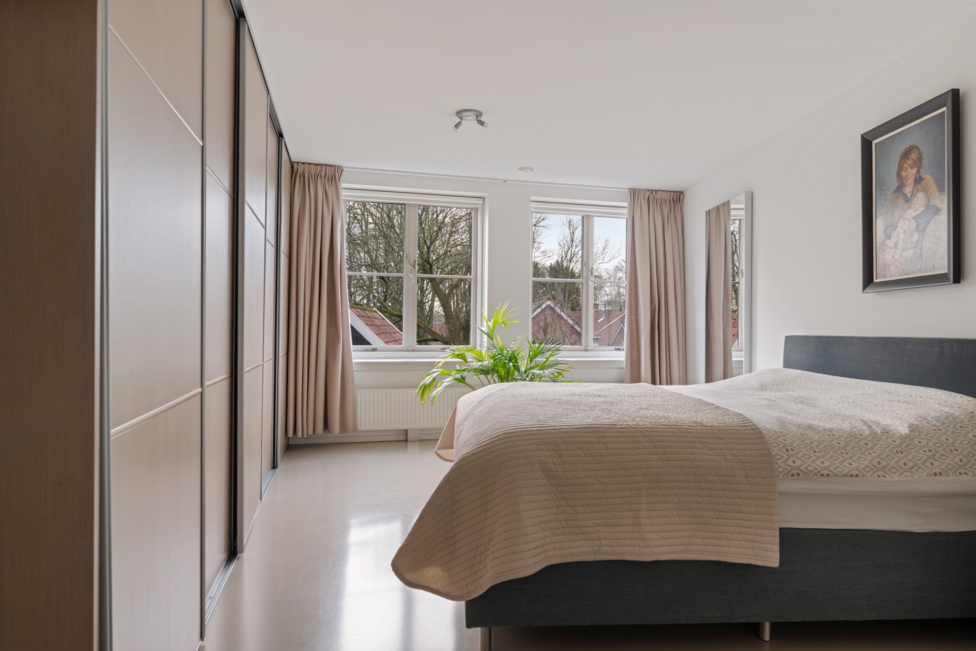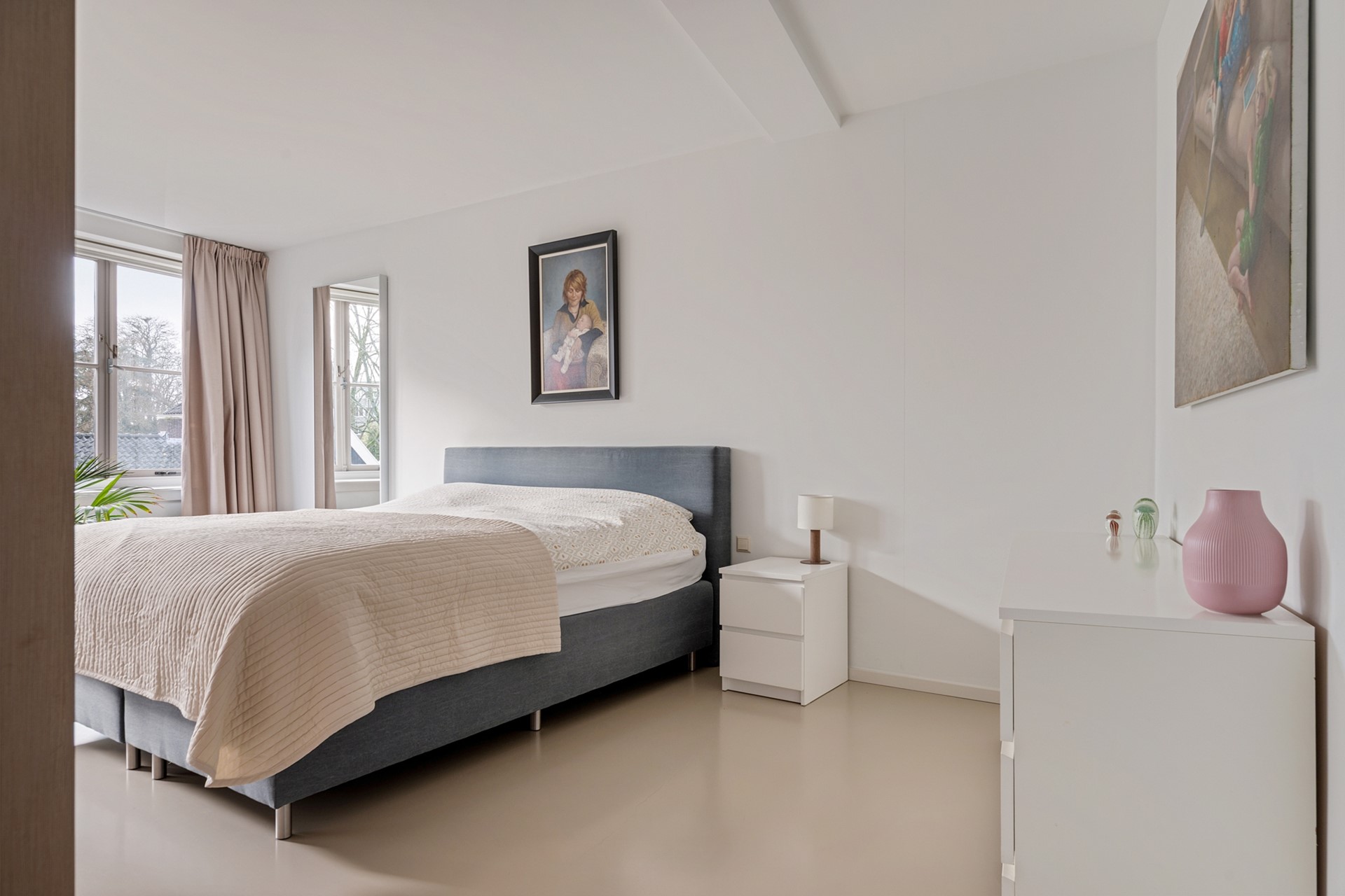 Via de trapopgang bereik je de eerste etage. Deze betonnen tussenvloer is voorzien van een gietvloer. De grootste slaapkamer van 23m² is aan de achterzijde gelegen en beschikt over een grote kastenwand. Via de grote ramen met roedeverdeling heb je niet alleen zicht op de Grote Kerk, maar ook op de achterliggende vesting. Een tweede en derde slaapkamer liggen aan de rustige voorzijde. De moderne badkamer in lichte kleurstelling is voorzien van een ligbad, dubbele wastafel en inloopdouche. Aan de overloop is een separate moderne toiletruimte met fonteintje te vinden.
