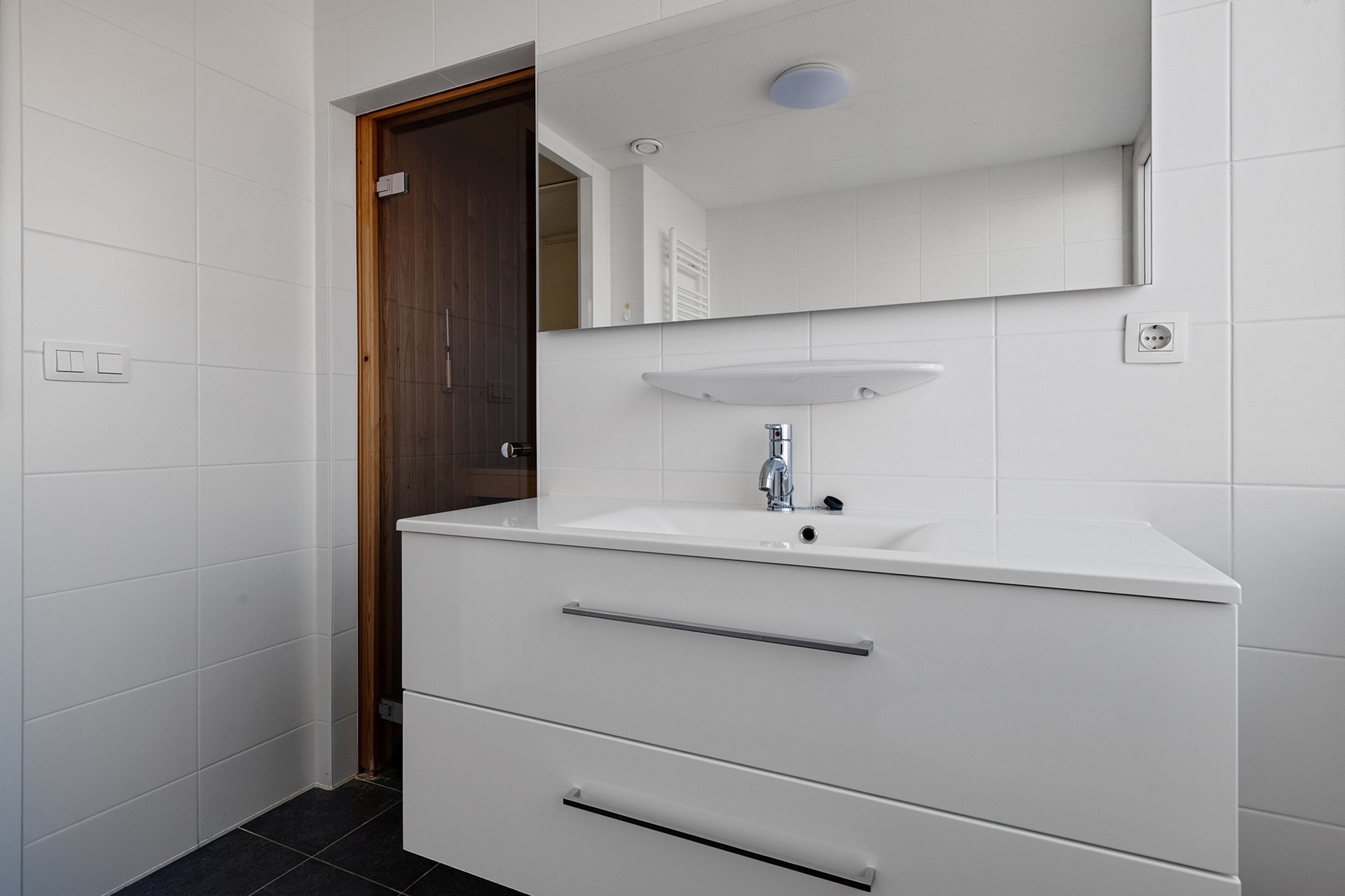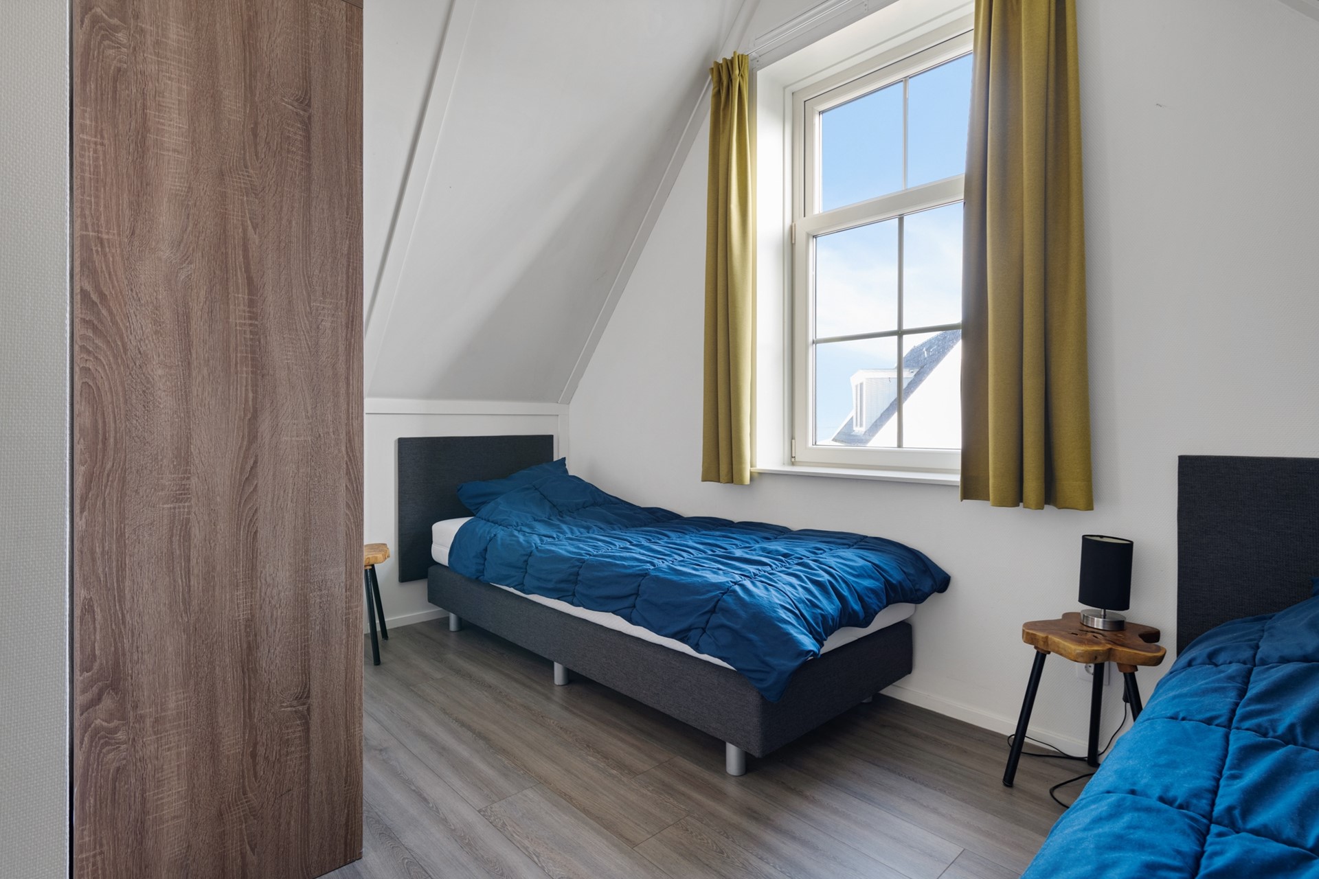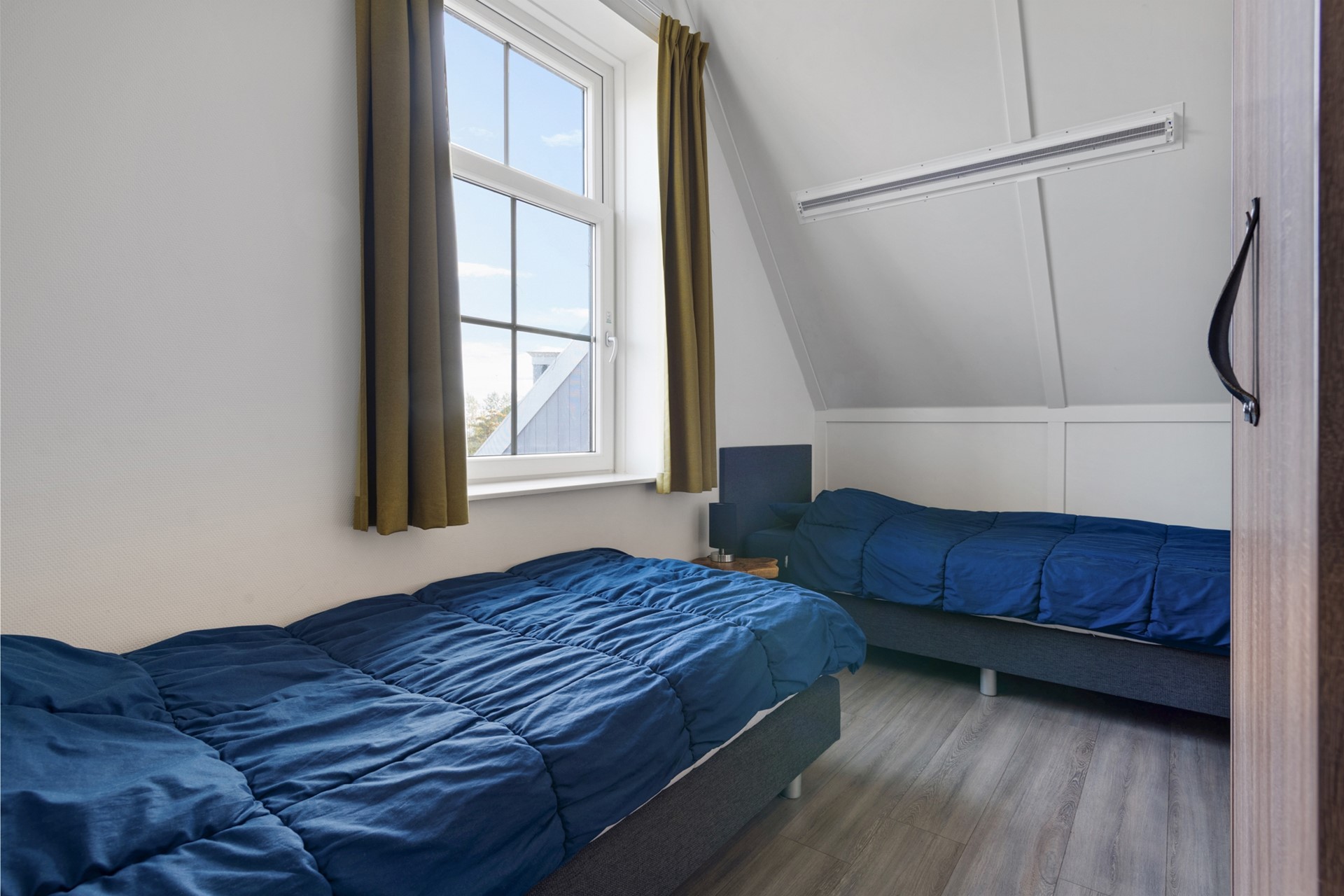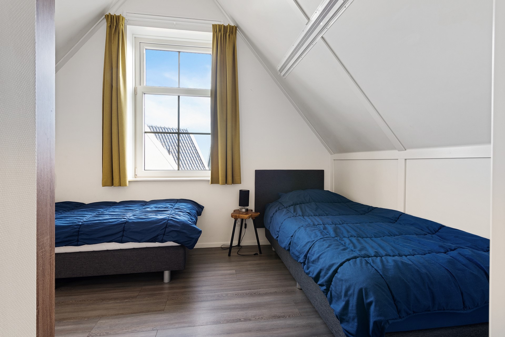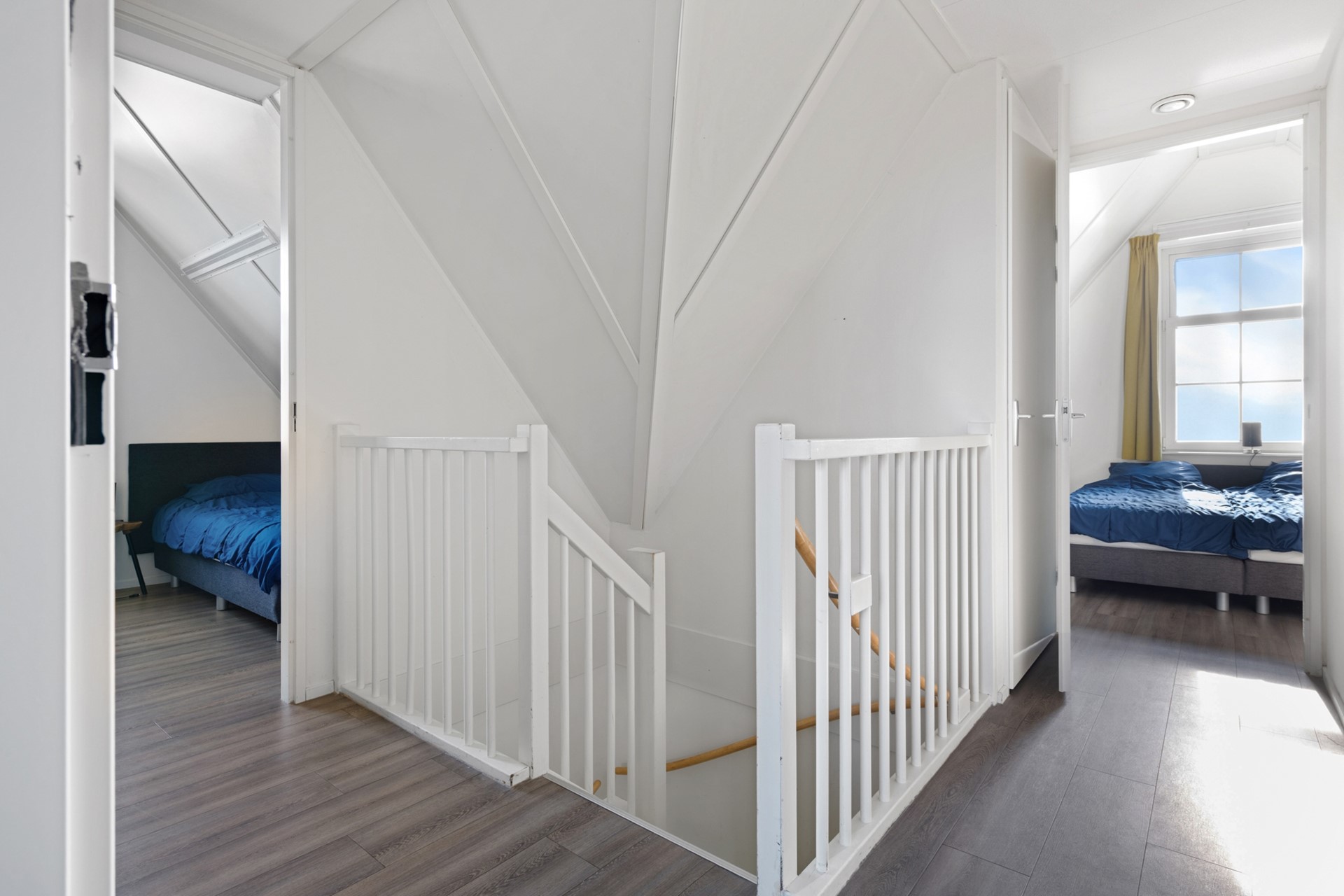 De trap in de hal verschaft de toegang tot de eerste etage, waar een drietal slaapkamers te vinden is. Deze gehele verdieping is voorzien van een drempelloze laminaatvloer. De kleinste slaapkamer is voorzien van 2 enkele box spring bedden en een kast, de andere twee kamers zijn groter en ieder voorzien van dubbele box spring bedden en kastruimte. Aan de overloop zijn 2 badkamers te vinden. Eentje voorzien van tweede toilet, wastafelmeubel en douche en de andere met derde toilet, ligbad en wastafelmeubel. Deze laatste badkamer geeft ook toegang tot de sauna. Aan de overloop bevindt zich nog een ruime inbouwkast met wasmachineaansluiting.