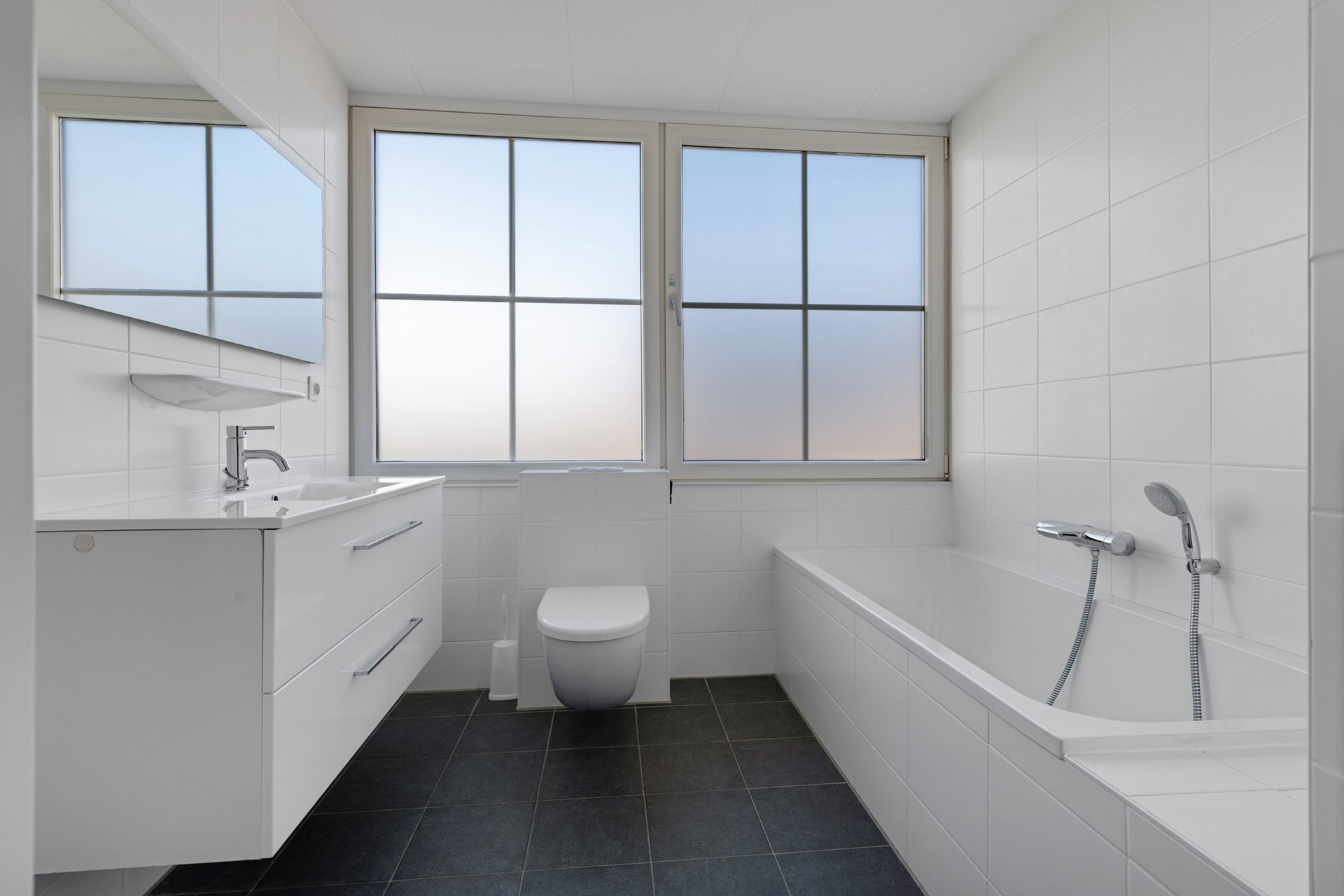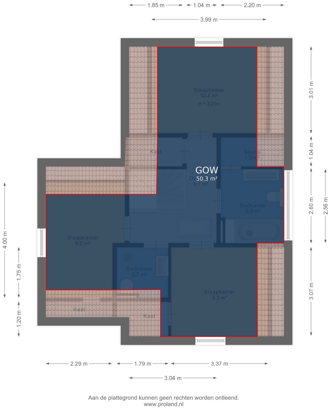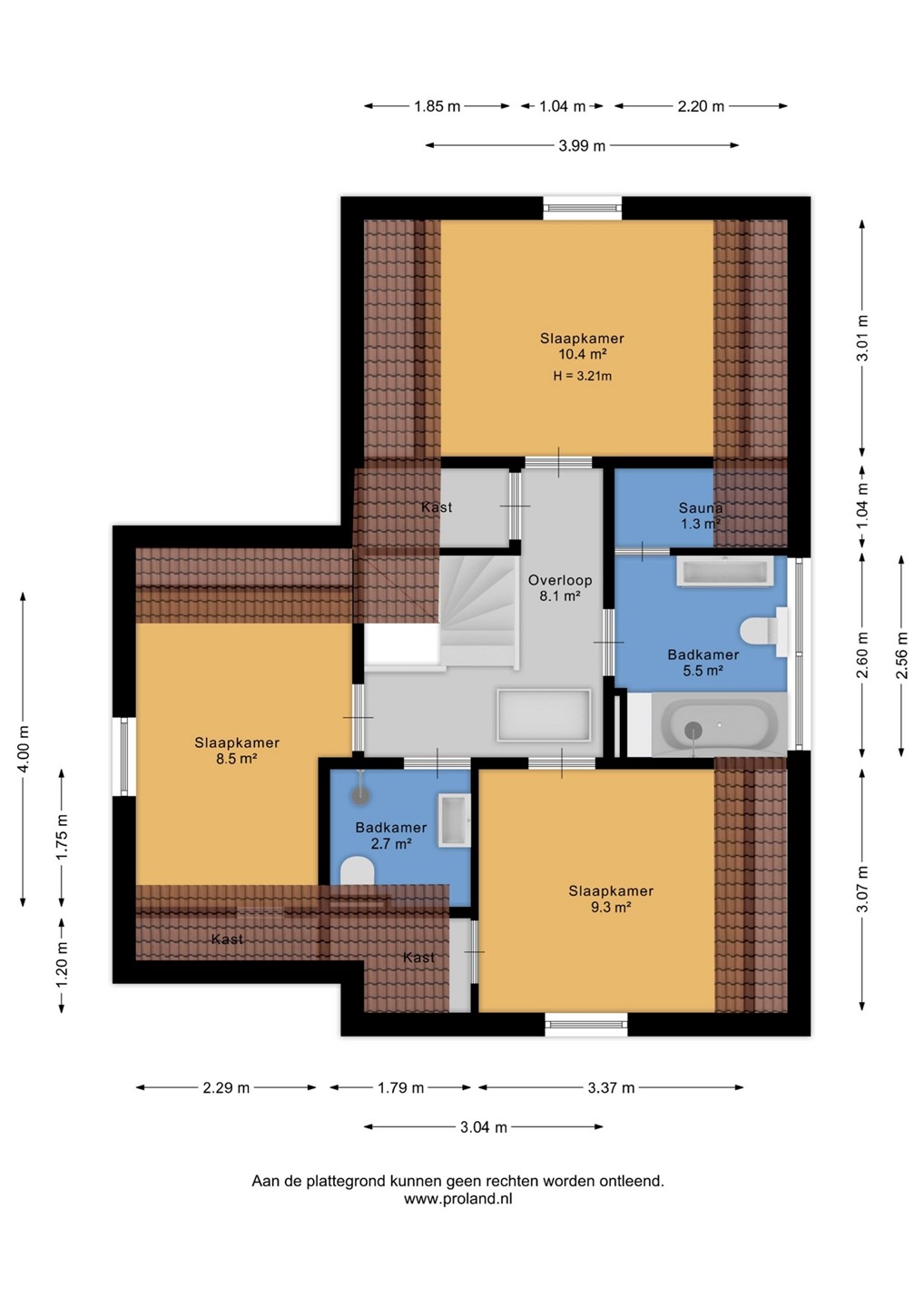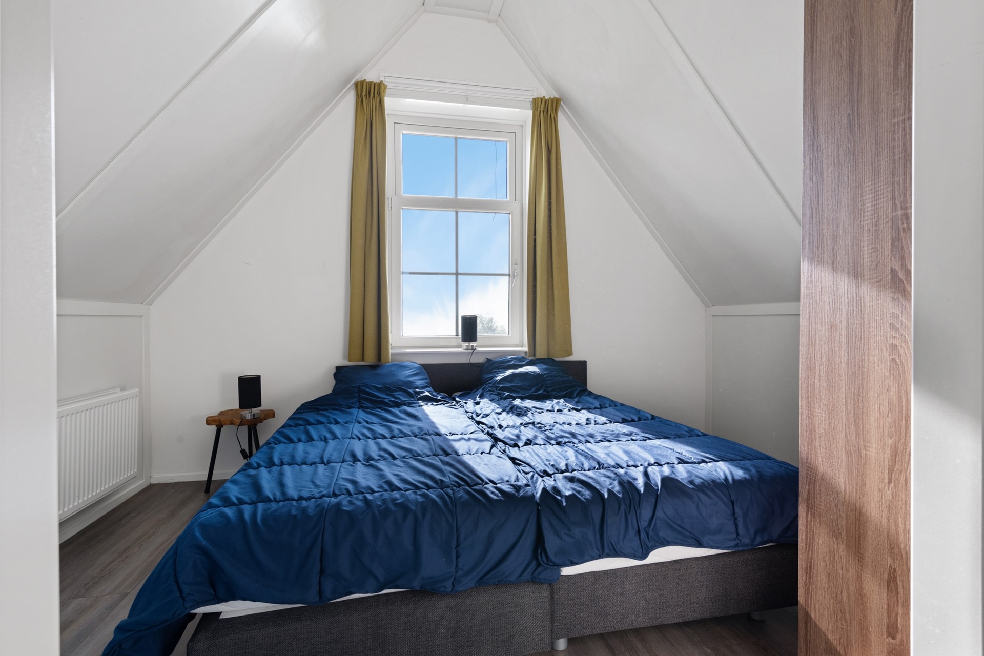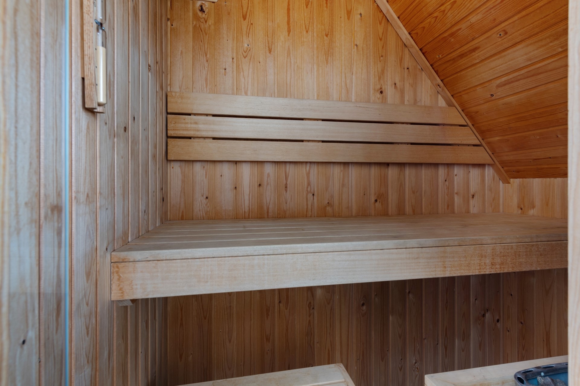 De trap in de hal verschaft de toegang tot de eerste etage, waar een drietal slaapkamers te vinden is. Deze gehele verdieping is voorzien van een drempelloze laminaatvloer. De kleinste slaapkamer is voorzien van 2 enkele box spring bedden en een kast, de andere twee kamers zijn groter en ieder voorzien van dubbele box spring bedden en kastruimte. Aan de overloop zijn 2 badkamers te vinden. Eentje voorzien van tweede toilet, wastafelmeubel en douche en de andere met derde toilet, ligbad en wastafelmeubel. Deze laatste badkamer geeft ook toegang tot de sauna. Aan de overloop bevindt zich nog een ruime inbouwkast met wasmachineaansluiting.