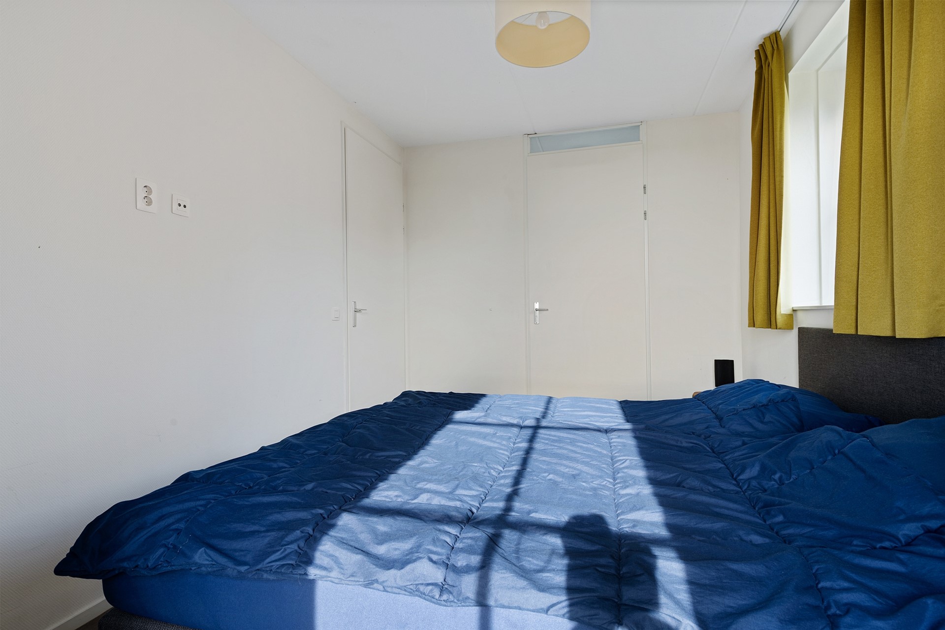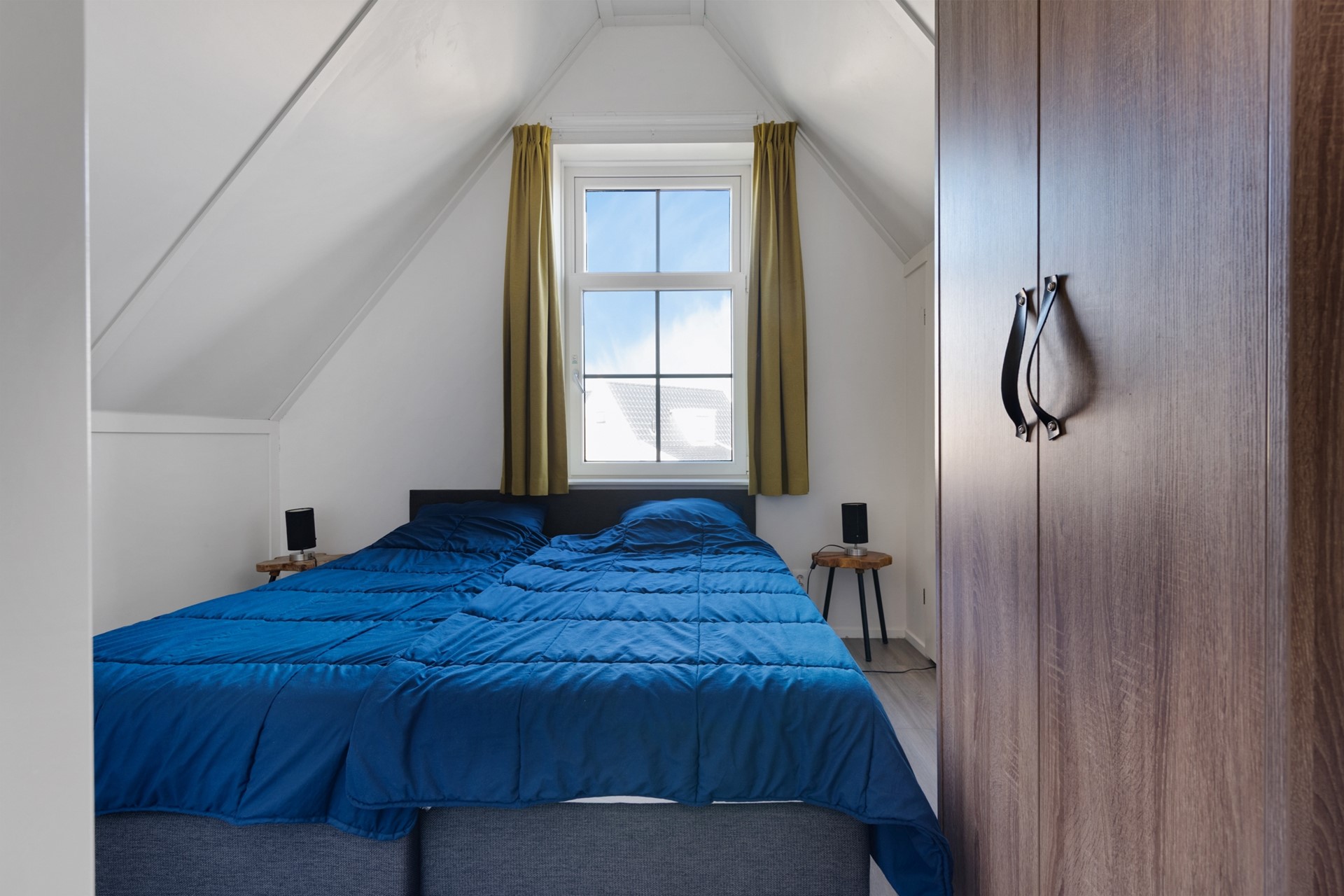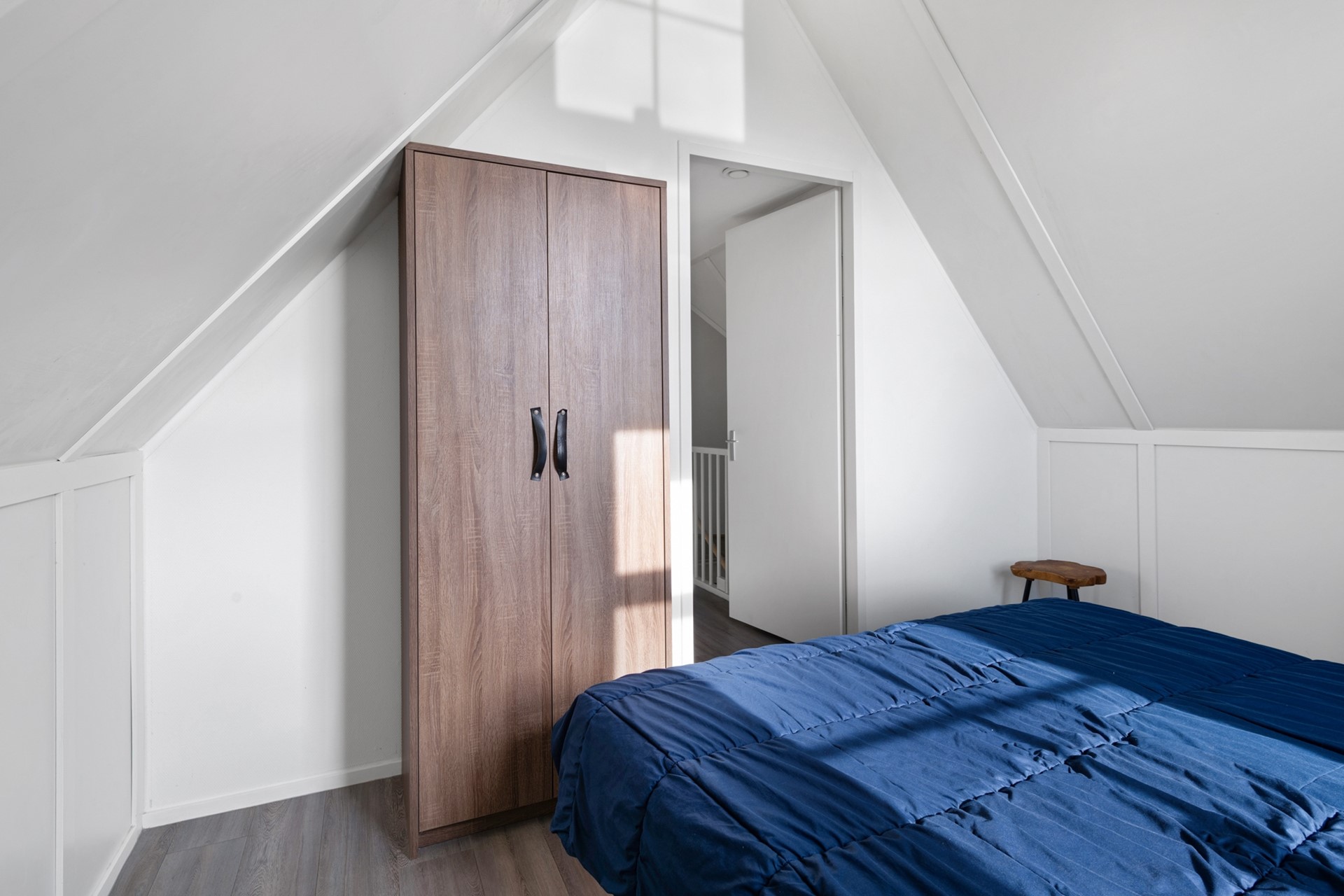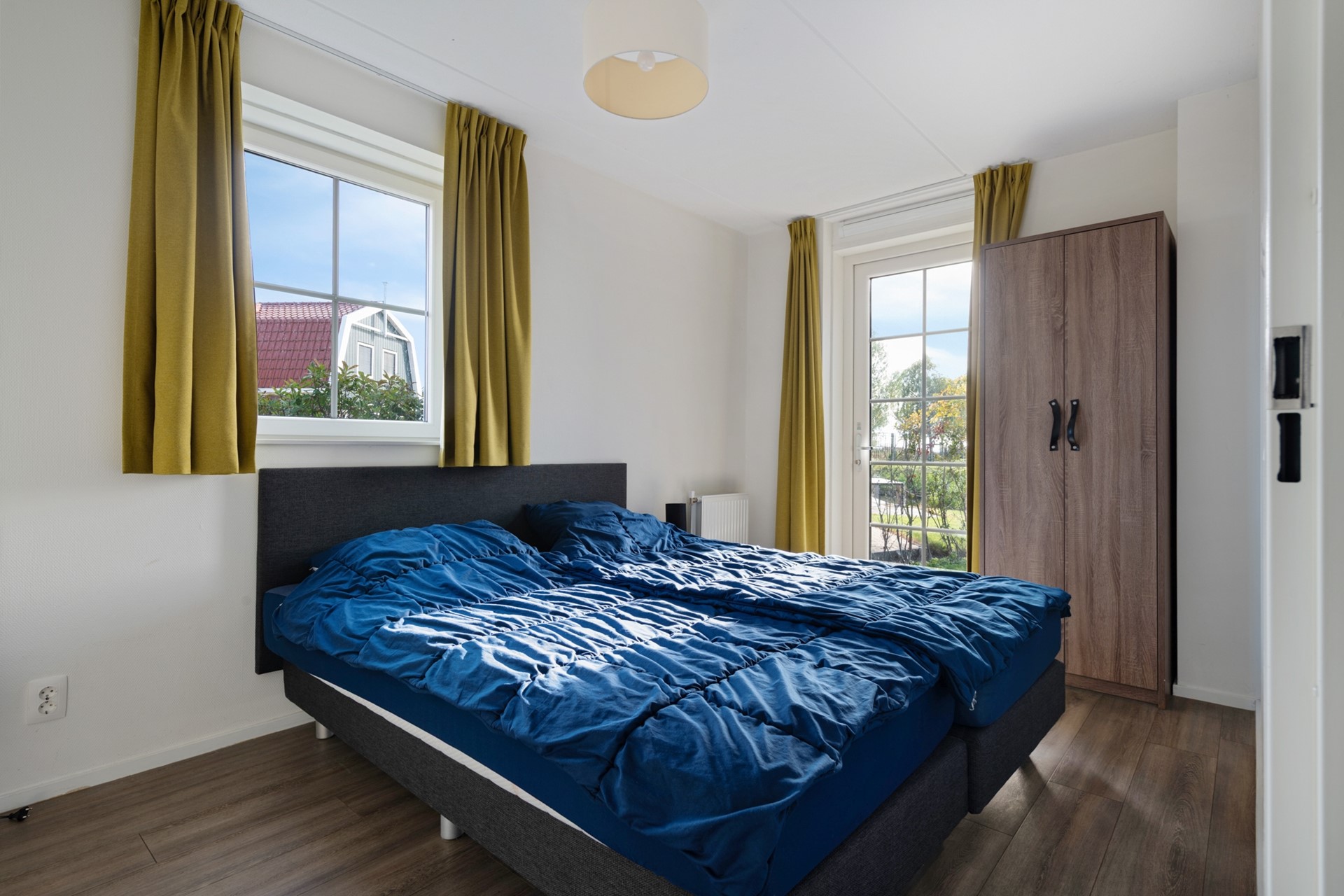 Vanuit de hal is ook de eerste slaapkamer te bereiken, die op de begane grond gelegen is. Deze slaapkamer biedt ruimte aan een tweepersoonsbed en kast en beschikt over een loopdeur naar de achtertuin en een eigen badkamer en suite, voorzien douche en wastafel met meubel.