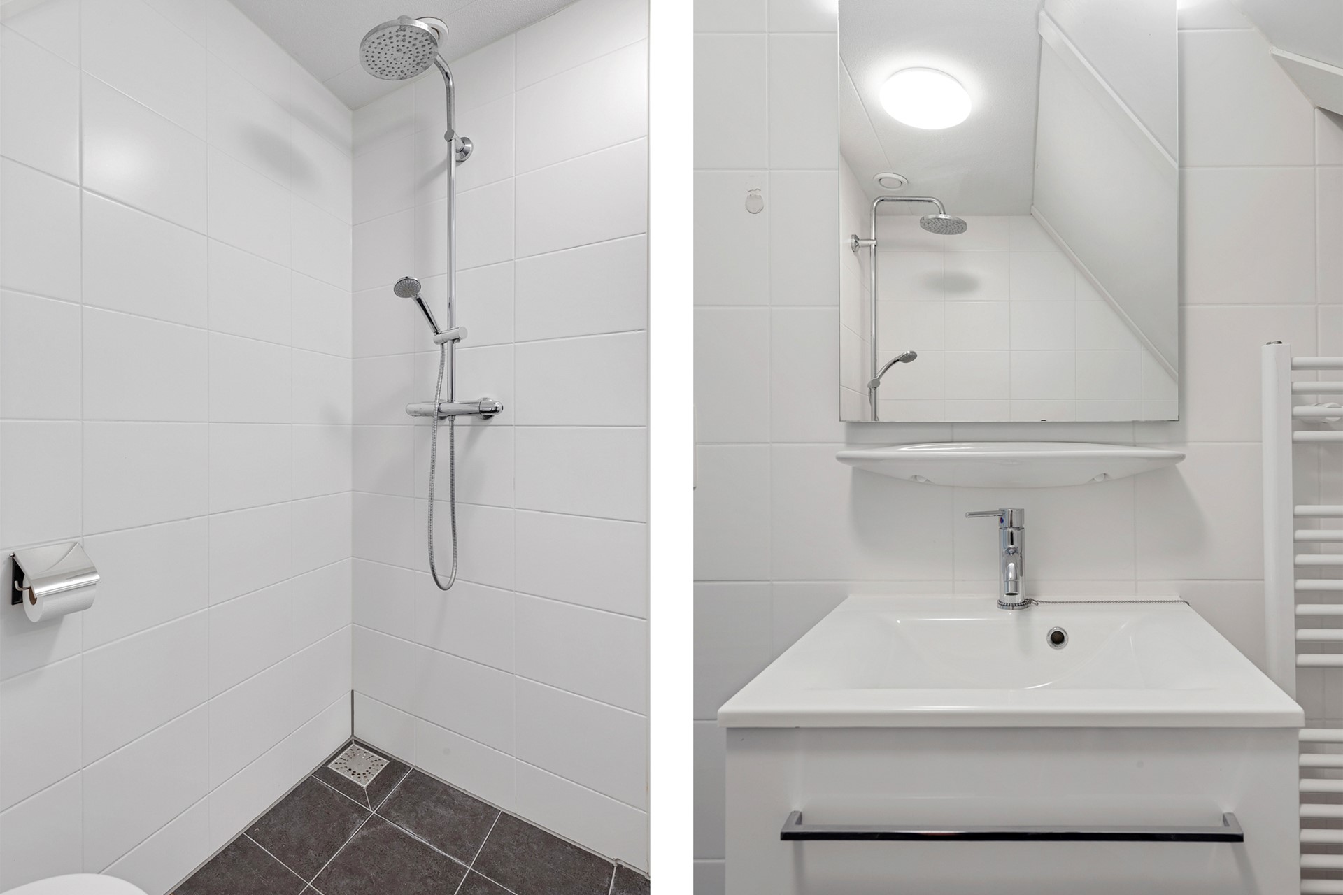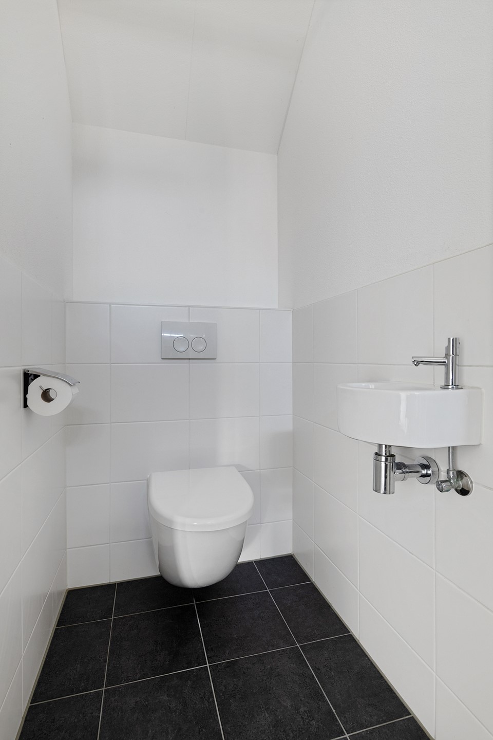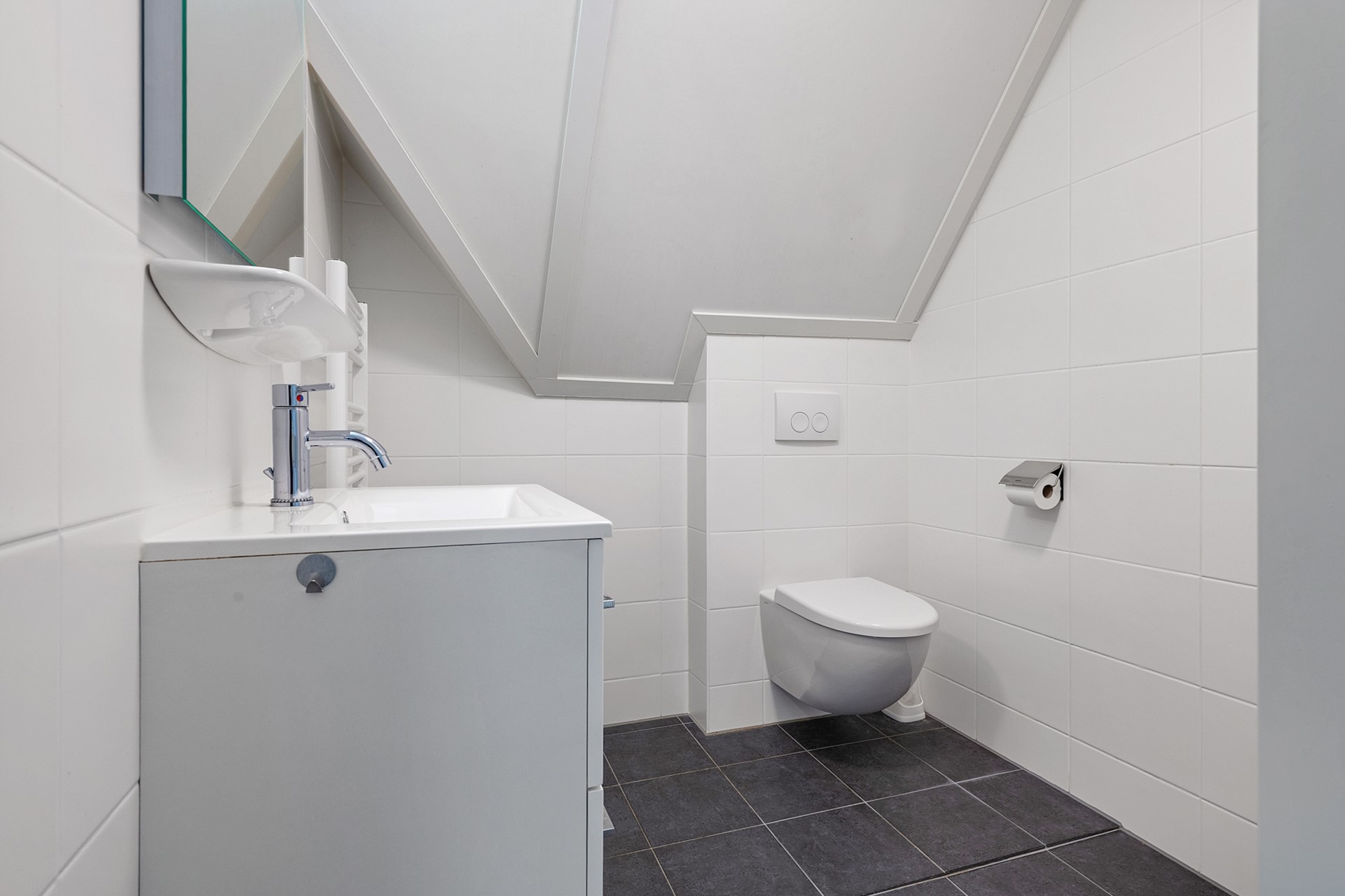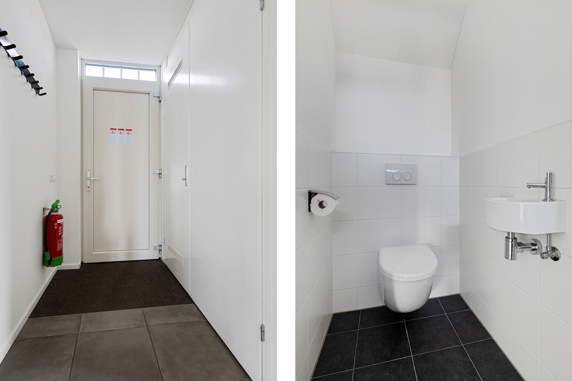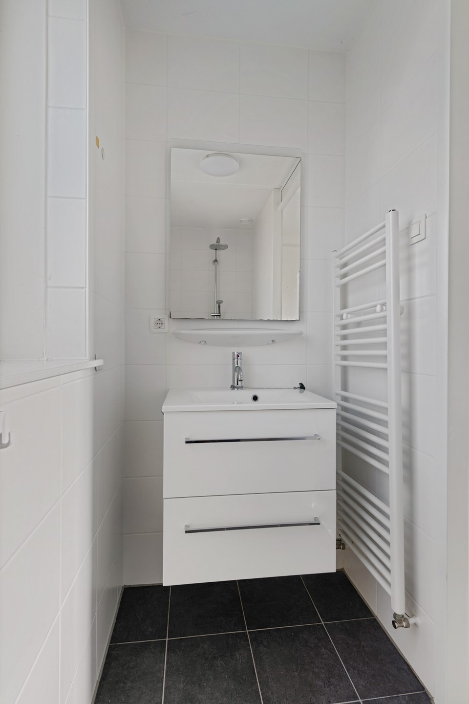 Vanuit de hal is ook de eerste slaapkamer te bereiken, die op de begane grond gelegen is. Deze slaapkamer biedt ruimte aan een tweepersoonsbed en kast en beschikt over een loopdeur naar de achtertuin en een eigen badkamer en suite, voorzien douche en wastafel met meubel.
