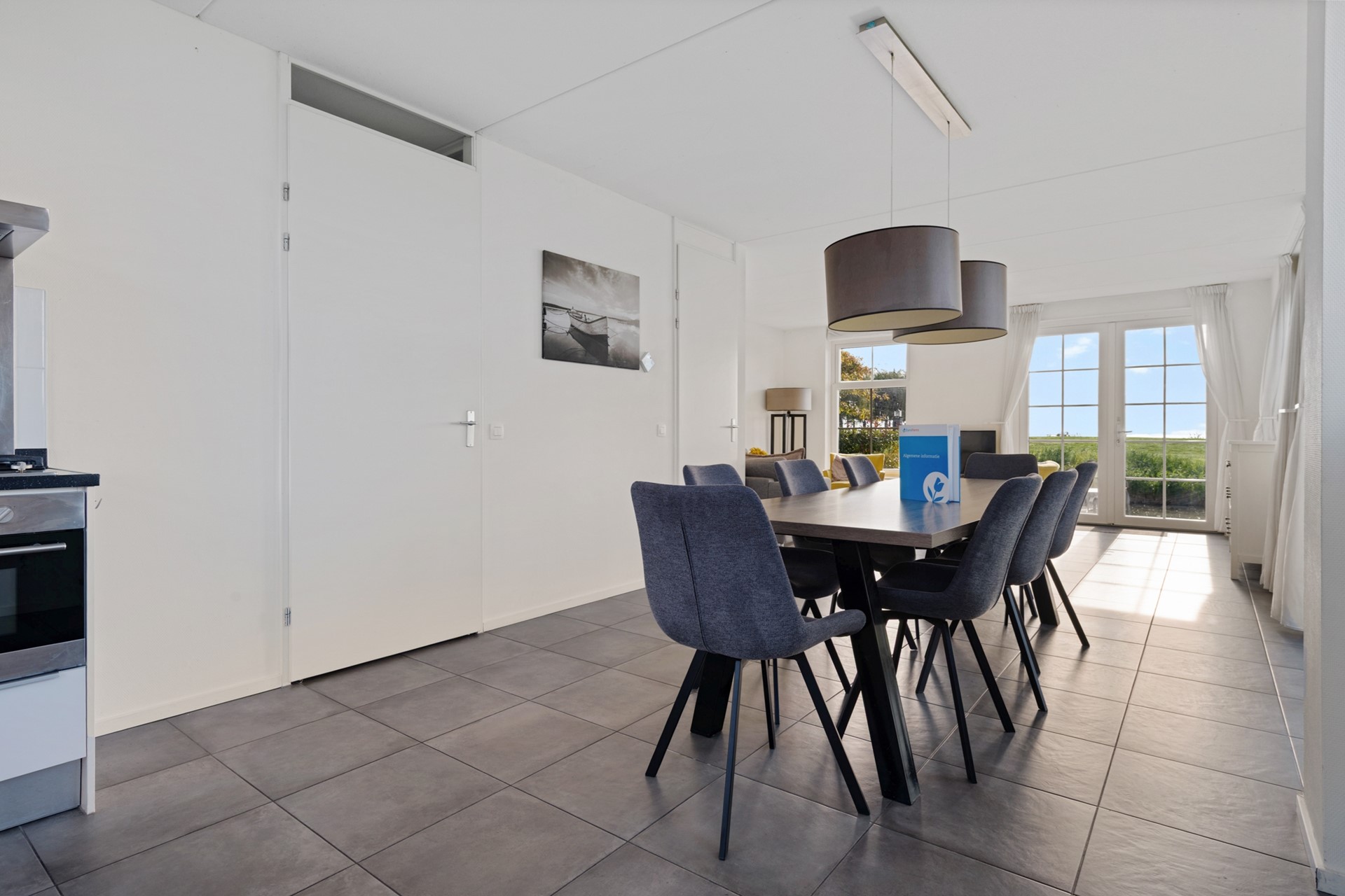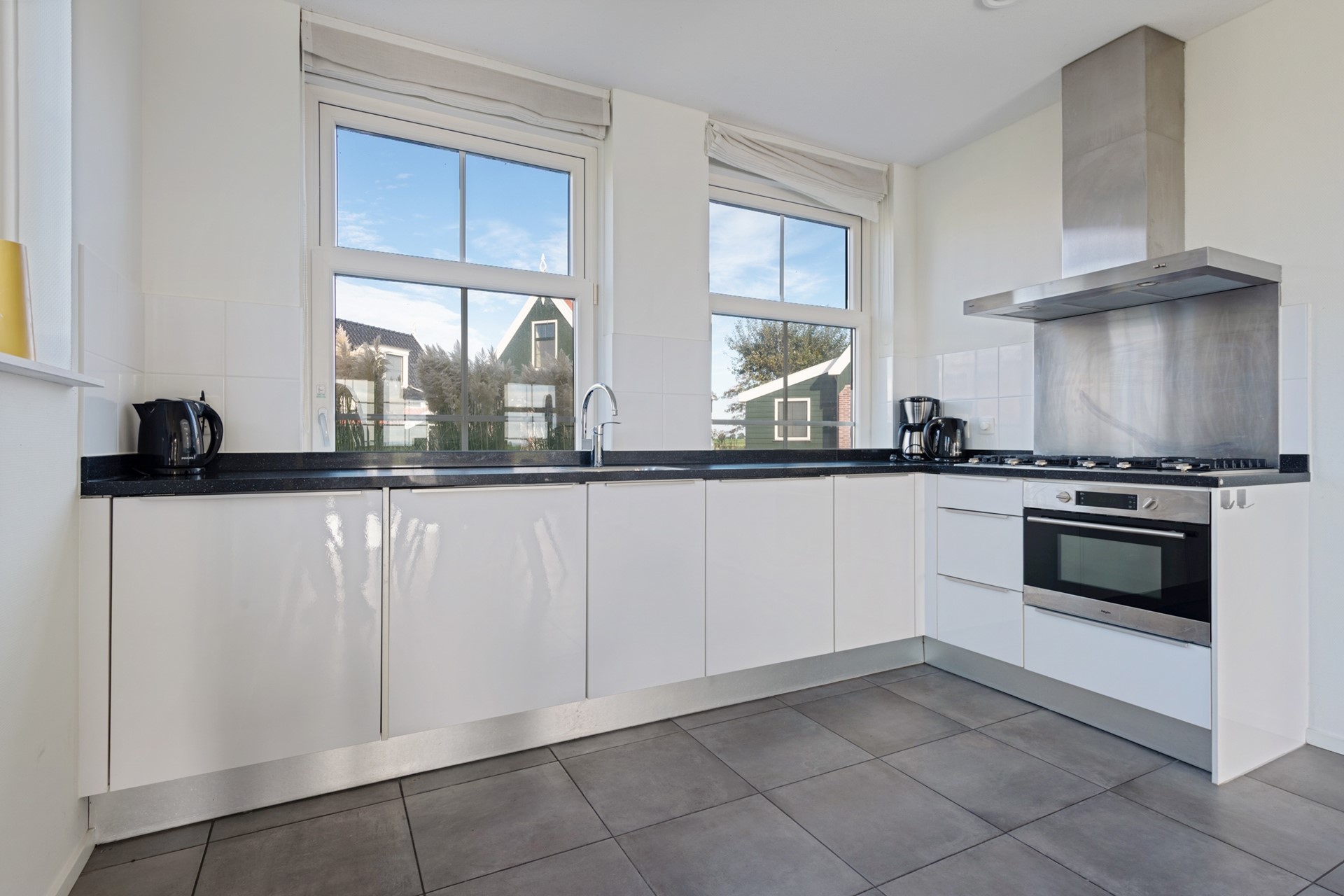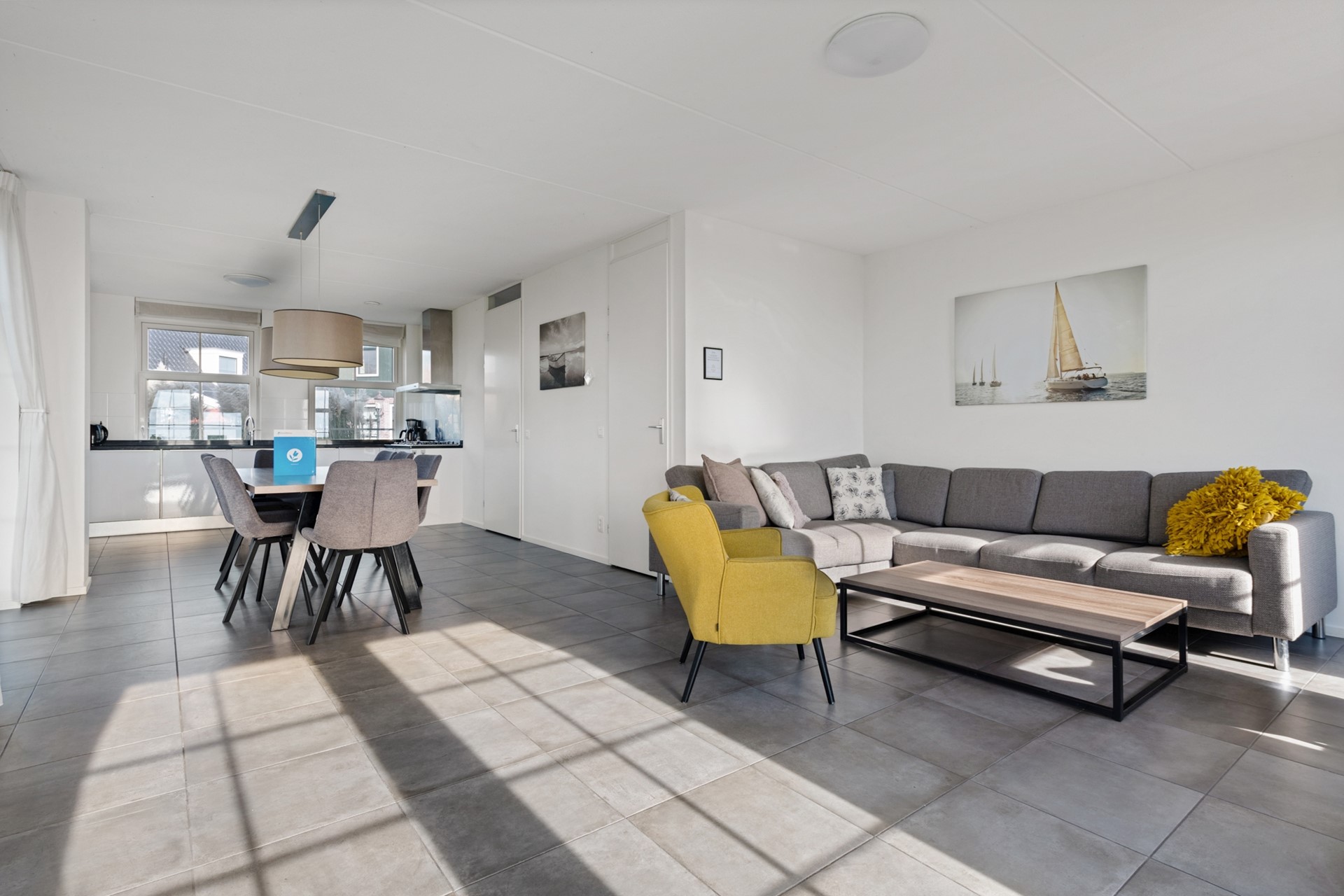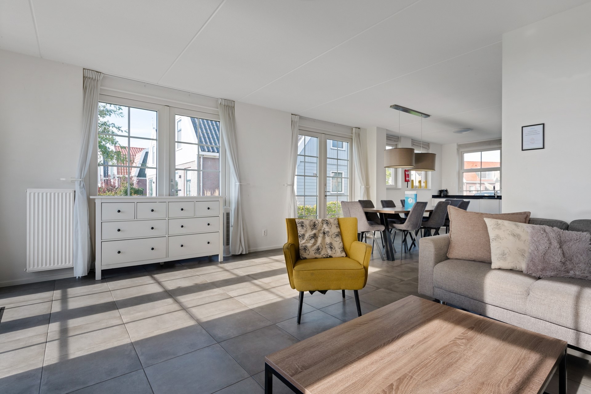 Deze ruime vakantiewoning is volledig uitgevoerd in neutrale grijs/wit tinten en wordt gemeubileerd verkocht. Op de gehele begane grond is de woning voorzien van een lichtgrijze plavuizenvloer. Na de entree, met meterkast, Cv-installatie (Intergas, 2018), garderobe, trapopgang en toiletruimte met zwevend toilet en fonteintje, stap je de woonkamer met open keuken in. De open L-vormige keuken is aan de voorzijde gelegen en beschikt over een stenen aanrechtblad met 6-pits fornuis en is voorzien van een oven, vaatwasser en twee koelkasten voorzien van vriesvak.