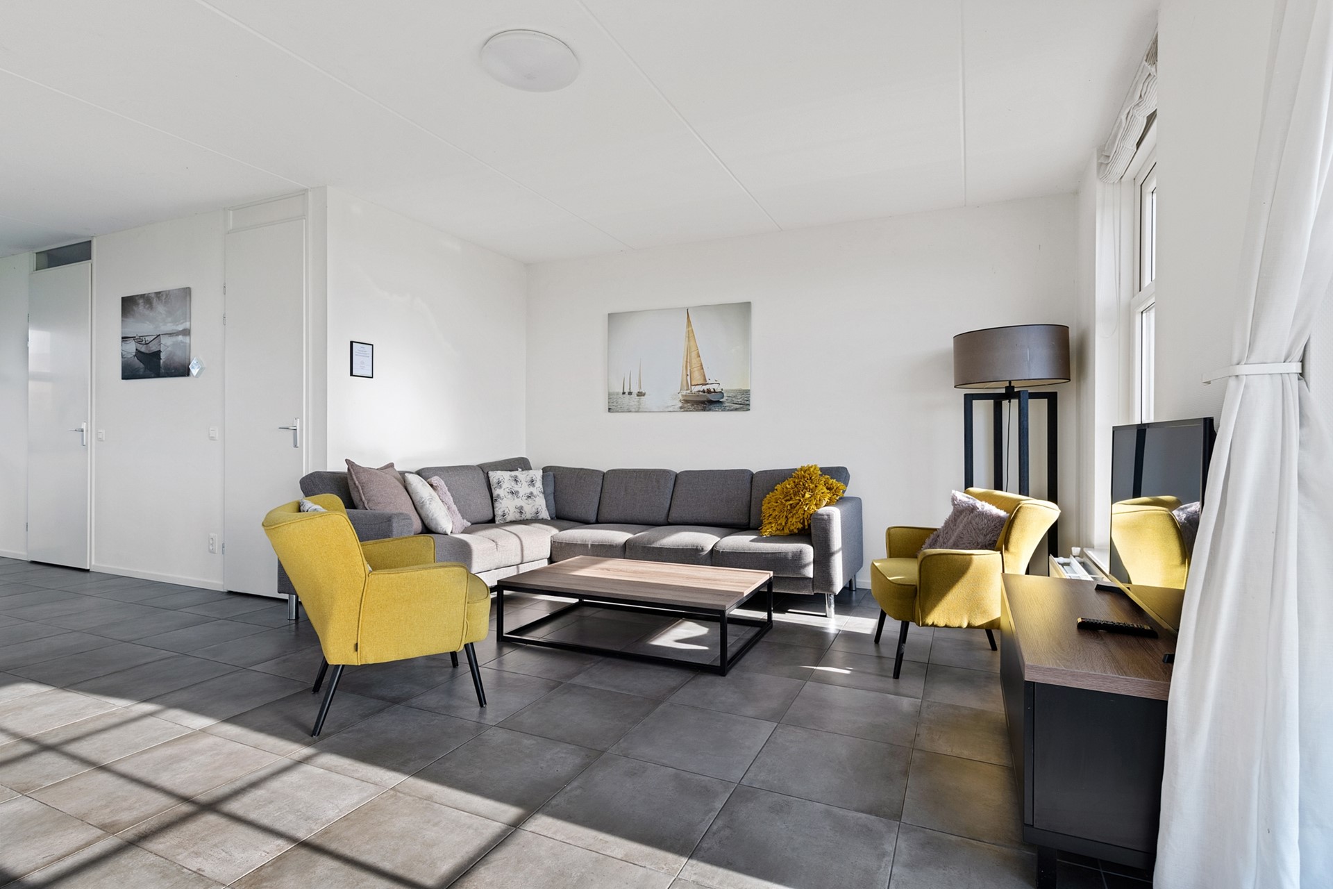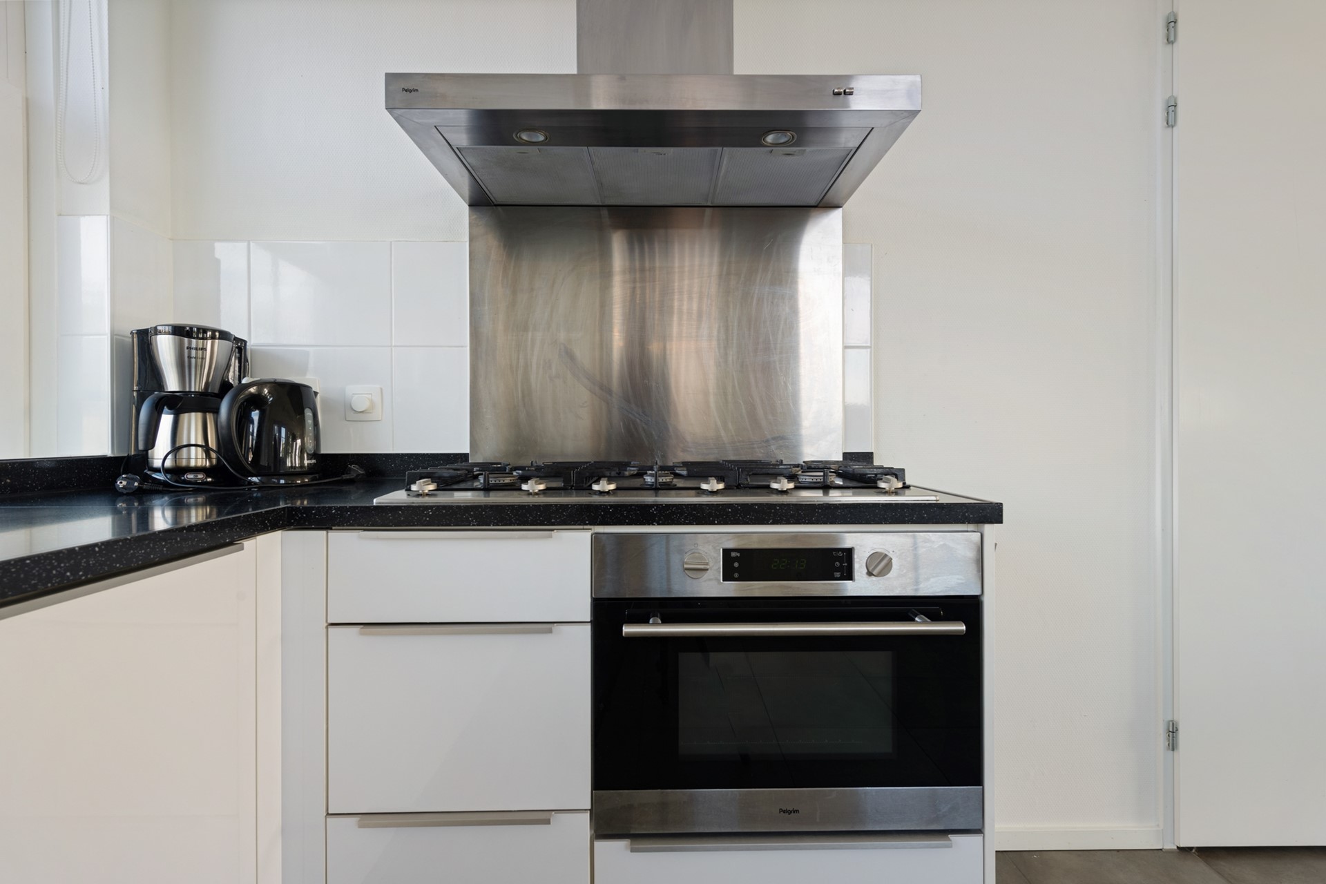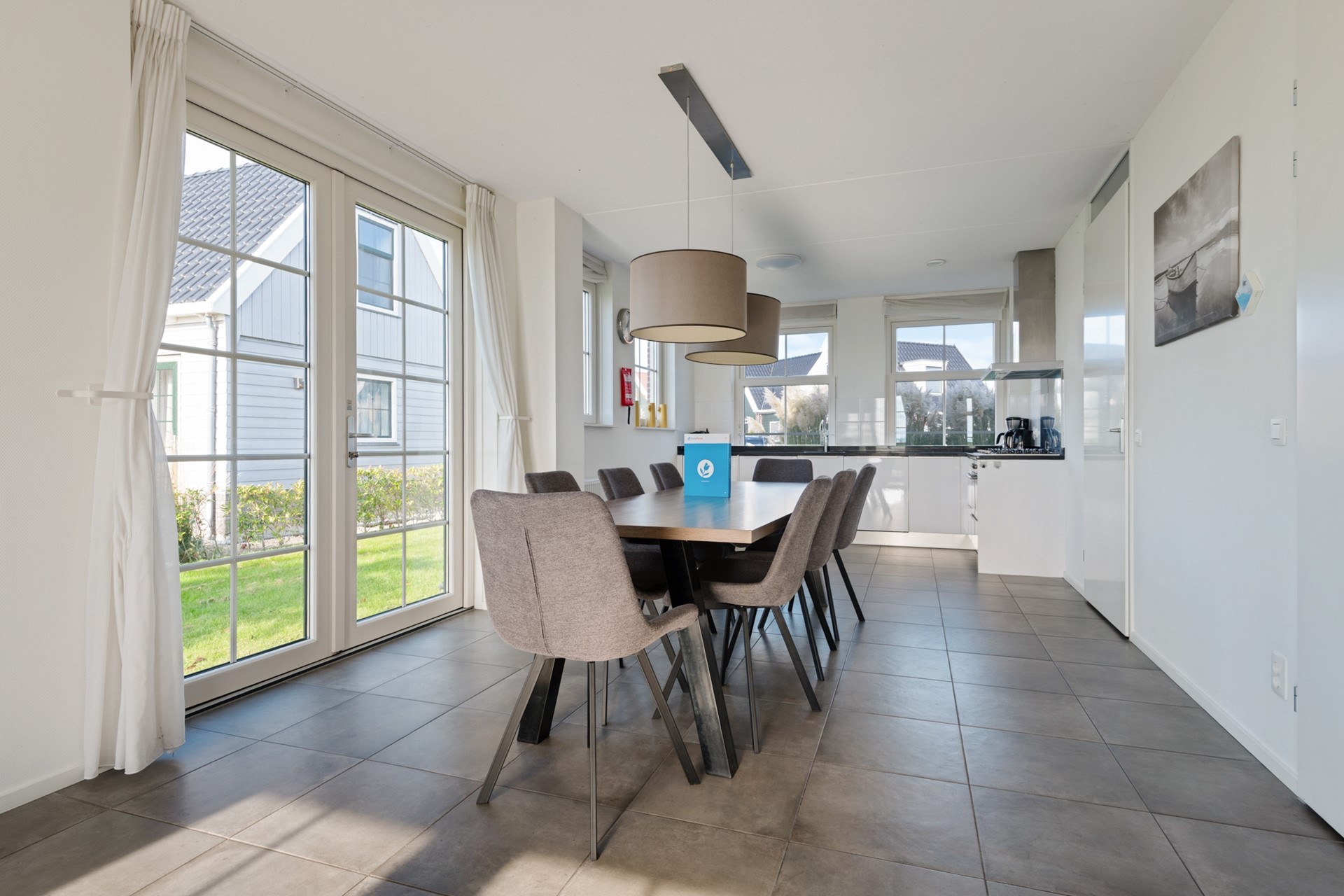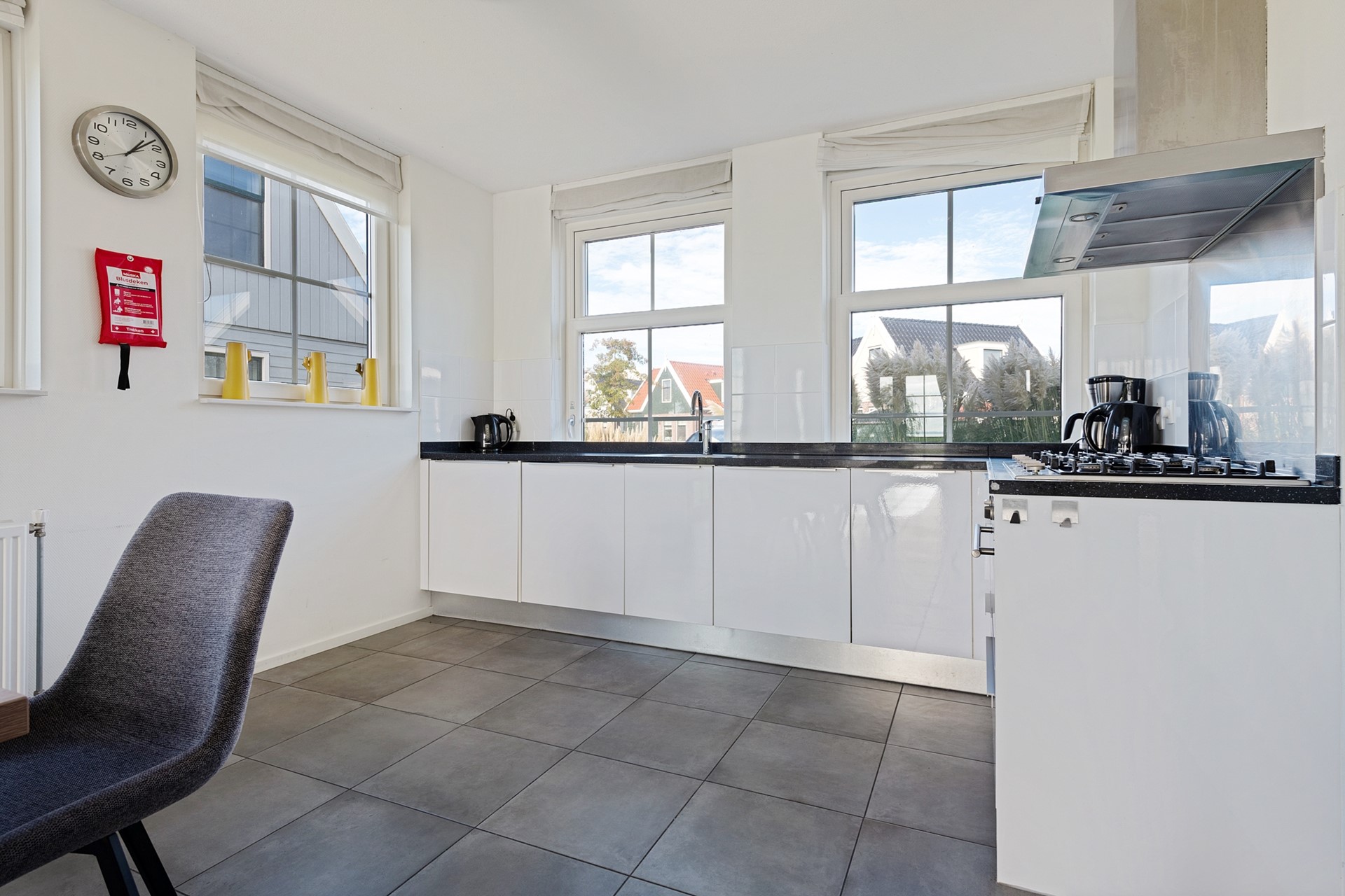 Deze ruime vakantiewoning is volledig uitgevoerd in neutrale grijs/wit tinten en wordt gemeubileerd verkocht. Op de gehele begane grond is de woning voorzien van een lichtgrijze plavuizenvloer. Na de entree, met meterkast, Cv-installatie (Intergas, 2018), garderobe, trapopgang en toiletruimte met zwevend toilet en fonteintje, stap je de woonkamer met open keuken in. De open L-vormige keuken is aan de voorzijde gelegen en beschikt over een stenen aanrechtblad met 6-pits fornuis en is voorzien van een oven, vaatwasser en twee koelkasten voorzien van vriesvak.